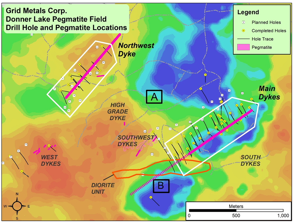 "We are pleased to see continued high-grade lithium values from our resource drilling at the Main Dyke, which is successfully tracing the Main Dyke to significant depth " said Robin Dunbar, President and CEO of Grid. "The Main Dyke to date has been very consistent in the core ~800m resource drilling area. While we have many more exploration targets at Donner Lake we are currently focused on delineating an initial resource for the property from both the Main and Northwest Dykes." he added.
