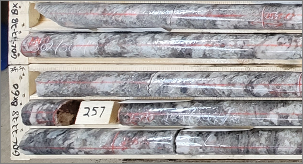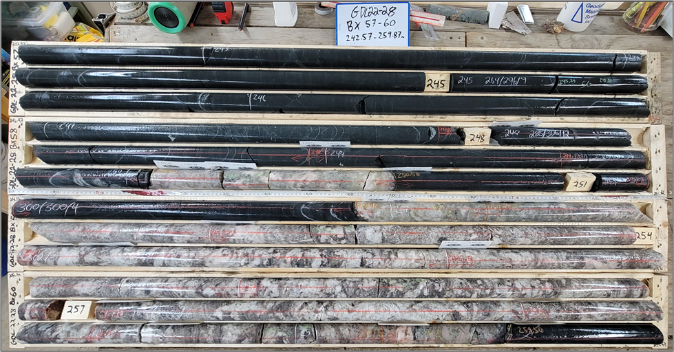 Above: Main Dyke in GDL22-28 (252.22 to 259.20 m grades 1.62% Li2O over 6.98 m)