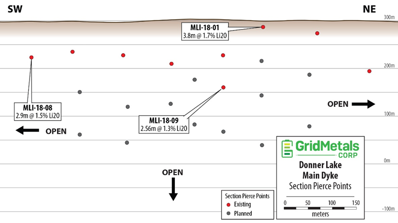 Northwest Dyke. Later in the program, resource delineation drilling will also be completed at the Northwest Dyke where fifteen ( 15) exploration holes were drilled by Grid in the first quarter of 2022. The fifteen drill holes cover a strike length of 500 meters and returned intersection depths of <100 to >250 metres. The results of that program showed that the near surface part of the Northwest Dyke has an average true thickness of ~ 4 meters and an average grade of 1.3% LiO2 (see the Company's July 28, 2022 New Release for details). The Northwest Dyke remains open along strike in both directions and to depth.