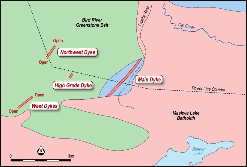 Above: Location of the Main Dyke and Northwest Dyke at the Donner Lake Lithium Property.