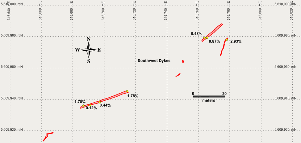 Above: Surface plan map of the Southwest Dykes with selected Li2O% values. Coordinates are based on he NAD83 UTM Zone 15N projection.