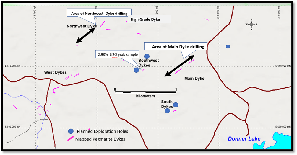 Above: Mapped pegmatite dykes at Donner Lake Lithium Property showing areas of resource drlling and preliminary exploration drill hole locations