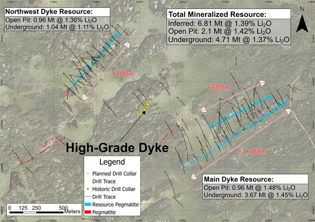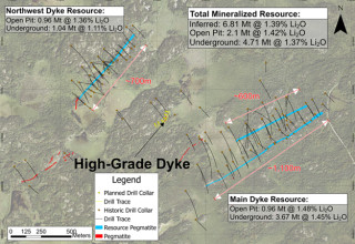 The High-Grade Dyke is located on the Donner lithium/cesium property, approximately 35 km from the Tanco Mine site. The dyke has seen limited exploration with drilling completed in the 1980's for tantalum. The HG Dyke contains the rare cesium mineral, pollucite - the preferred feedstock for the nearby Tanco cesium plant. Pollucite is only formed in the most fractionated LCT-type pegmatite bodies and is only known from a very small number of localities. A select composite surface grab sample from the High-Grade Dyke taken in 2024 returned 17.5% Cs2O associated with coarse-grained pollucite. The Company plans closely spaced drilling over a ~200 m strike length to test for any continuity of pollucite to a vertical extent of 30-50 m. By nature of its extremely fractionated nature, the HG Dyke has been the subject of multiple academic studies by world-renowned pegmatite researchers.