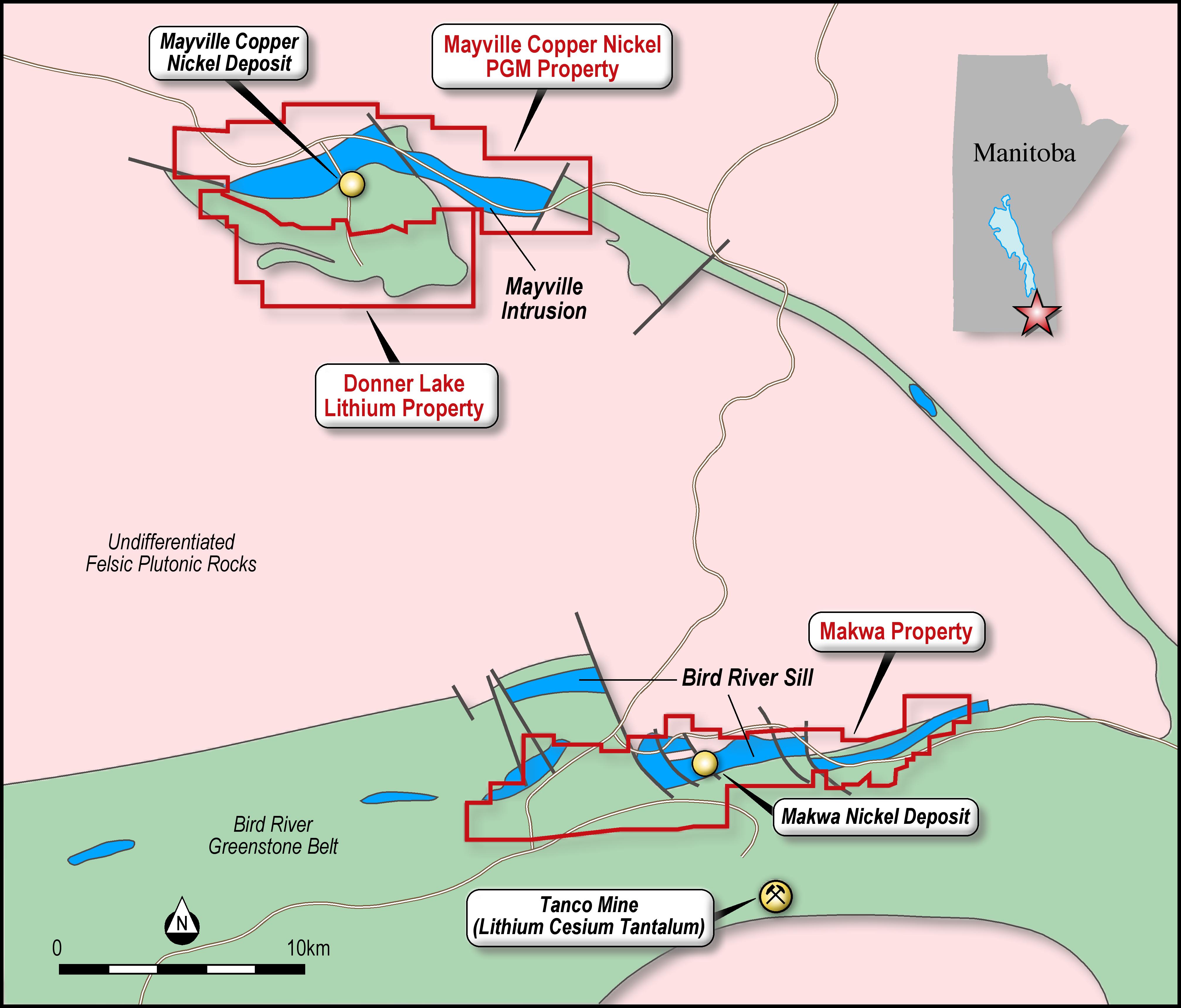 Above: Location of Donner Lake Lithium Property and Tanco Mine in southeastern Manitoba. The location of the Makwa Mayville Ni-Cu-PGM-Co deposits are also shown.
