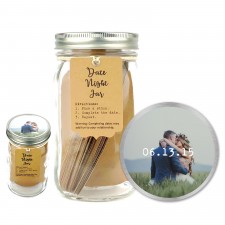 Each date night adventure jar can be purchased either as listed or with custom personalization of the couple’s names, photo, or a significant date such as their wedding date. Additionally, optional blank Popsicle-stick-shaped card stock inserts can be included in the jar for the couple to write their ideas onto and add to the jar.