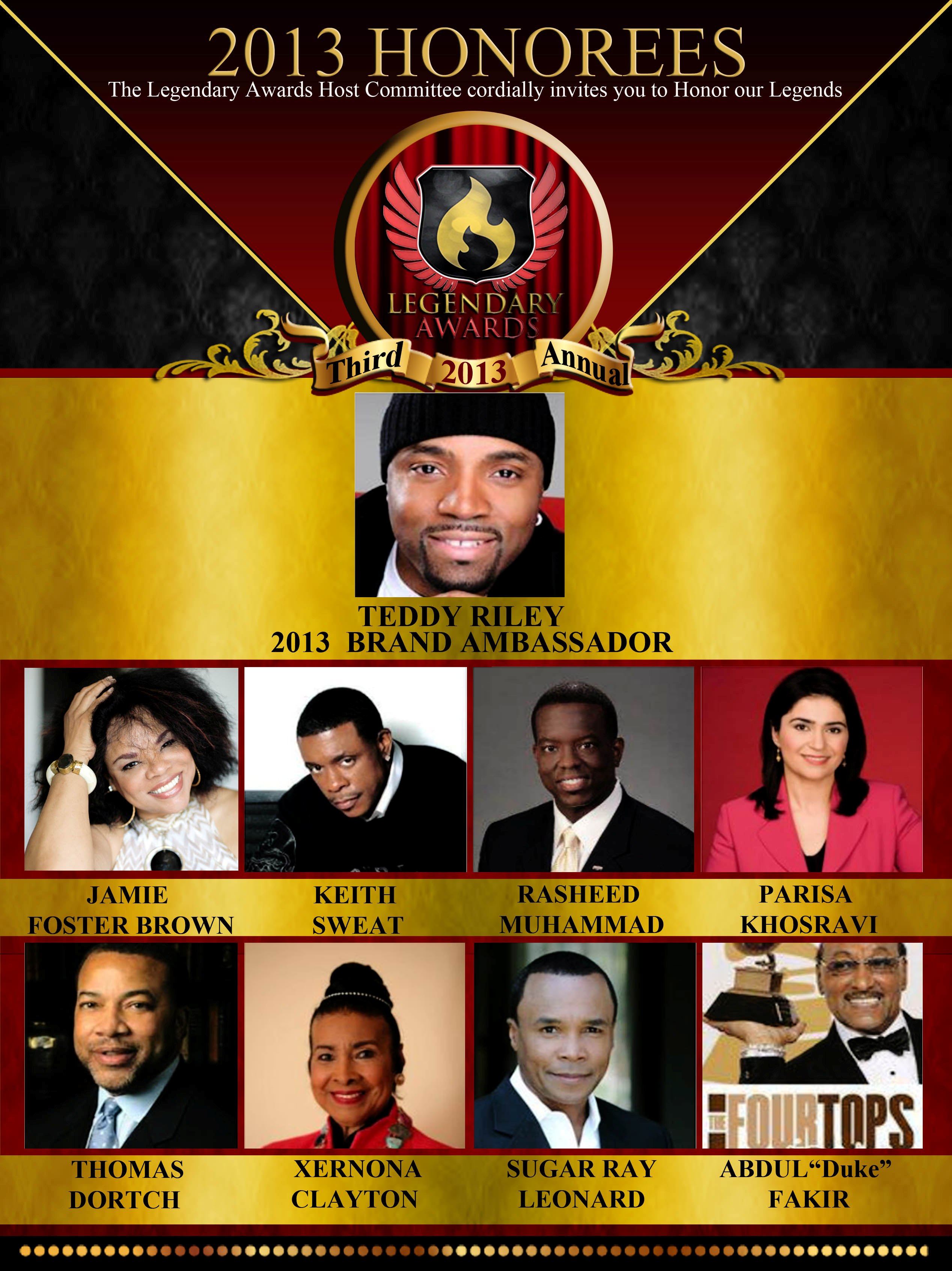 The 2013 Legendary Award honorees are: Brand Ambassor, Mr. Teddy Riley and his chosen Highlight Honorees Mr. Keith Sweat and Mr. Rasheed Muhammad, Media Icon Award Honoree, Ms. Jamie Foster Brown, Spotlight Award Honoree, Mr. Tommy W. Dortch Jr., Humanitarian Award Honoree, Ms. Parisa Khosravi, Life Time Achievement Award Honoree, Mr. Sugar Ray Leonard, Pioneer Award Honoree, Ms. Xernona Clayton, and The Legendary Award Honoree, Mr. Abdul 'Duke' Fakir of the Four Tops.