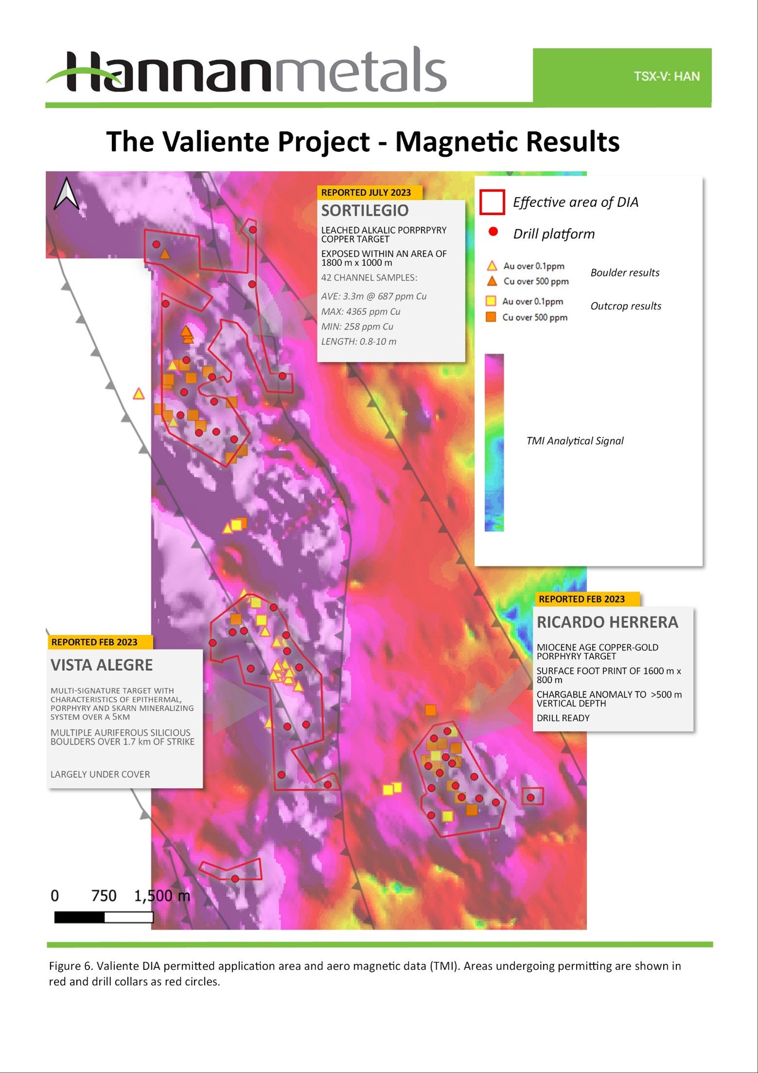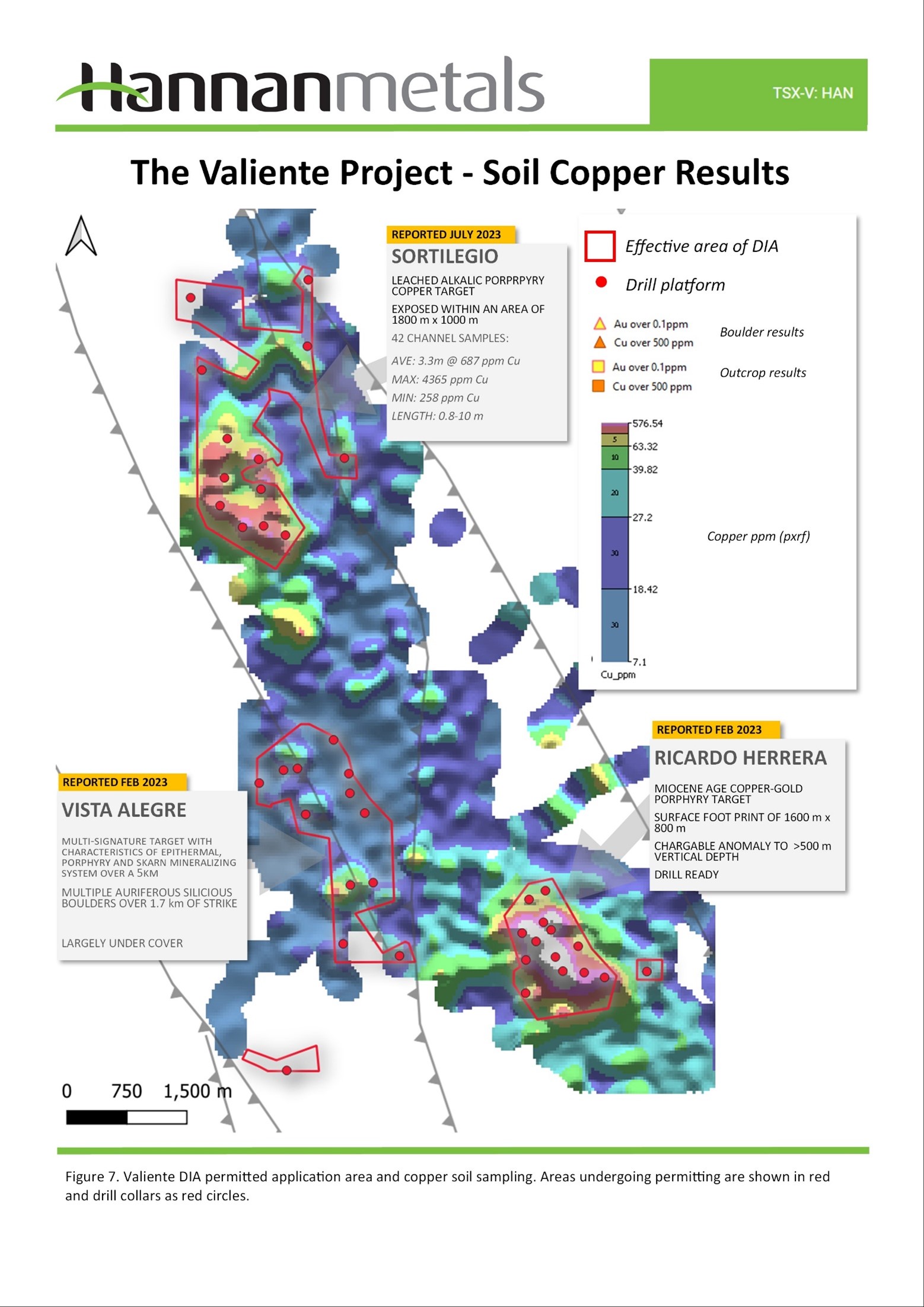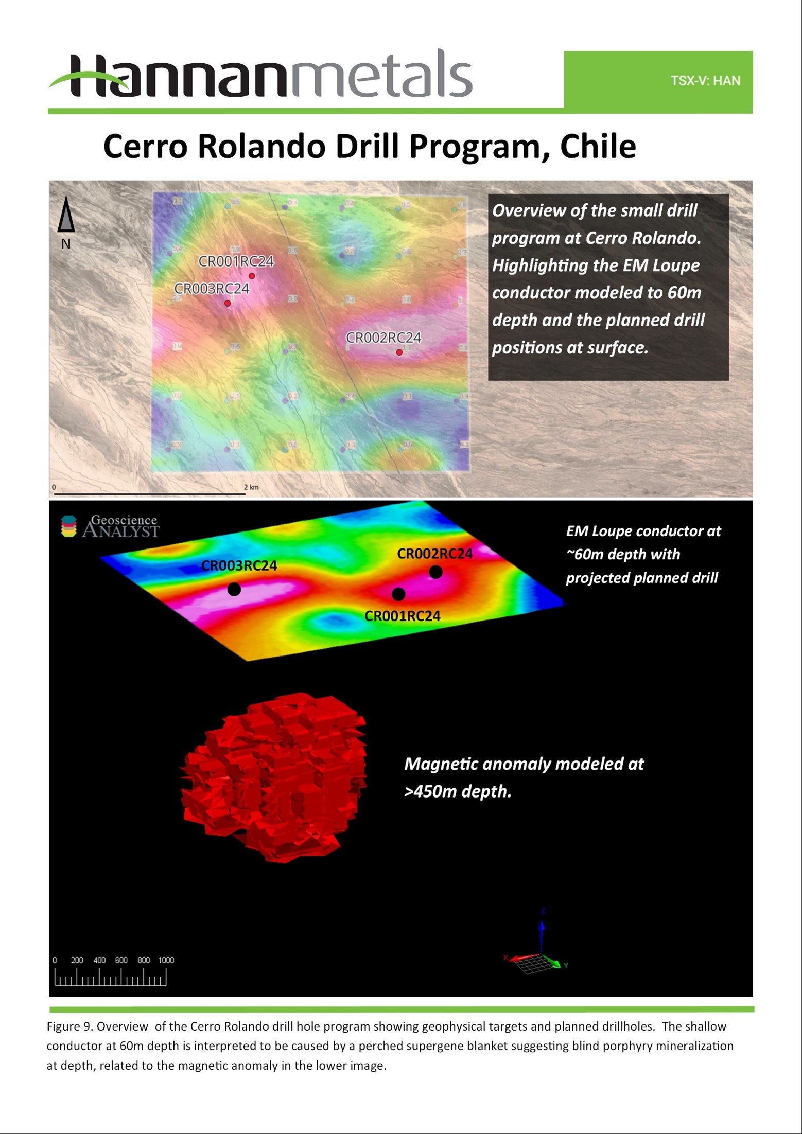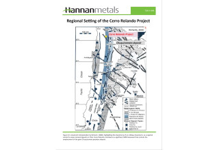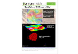 - Hannan is in the process of permitting a small drill program to test a shallow conductor at the Cerro Rolando Project in Chile. The conductor has been modeled to a depth of 60m and may represent a perched supergene blanket from a mineralized porphyry at depth.