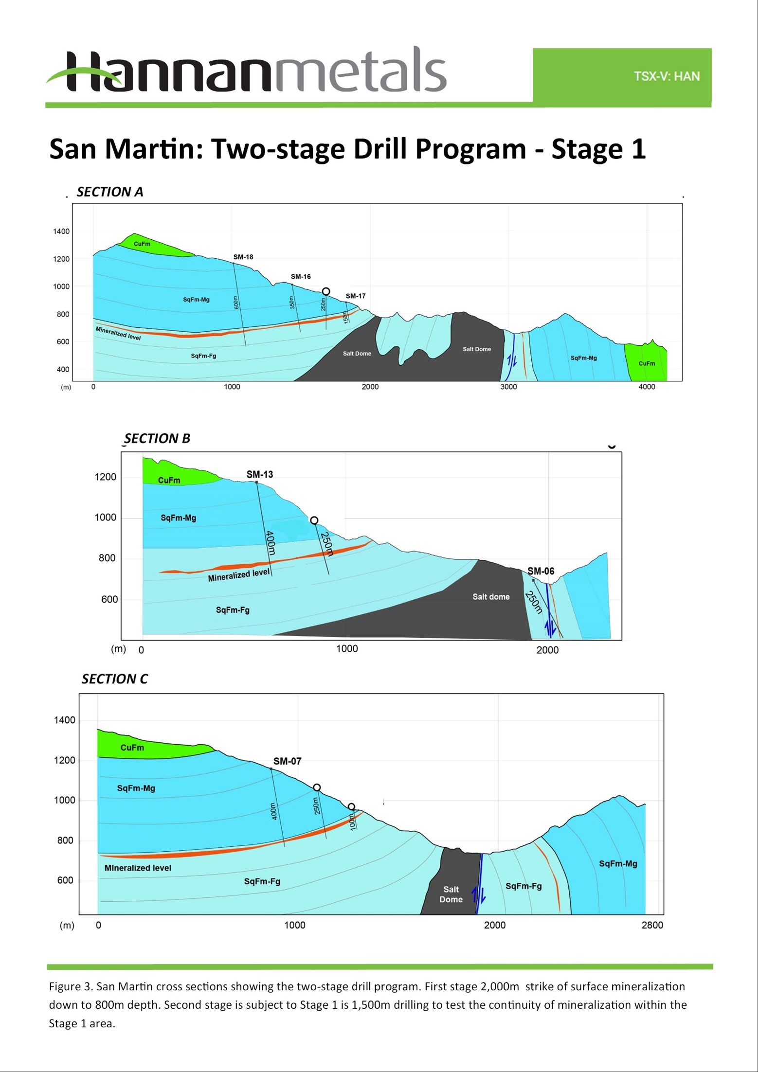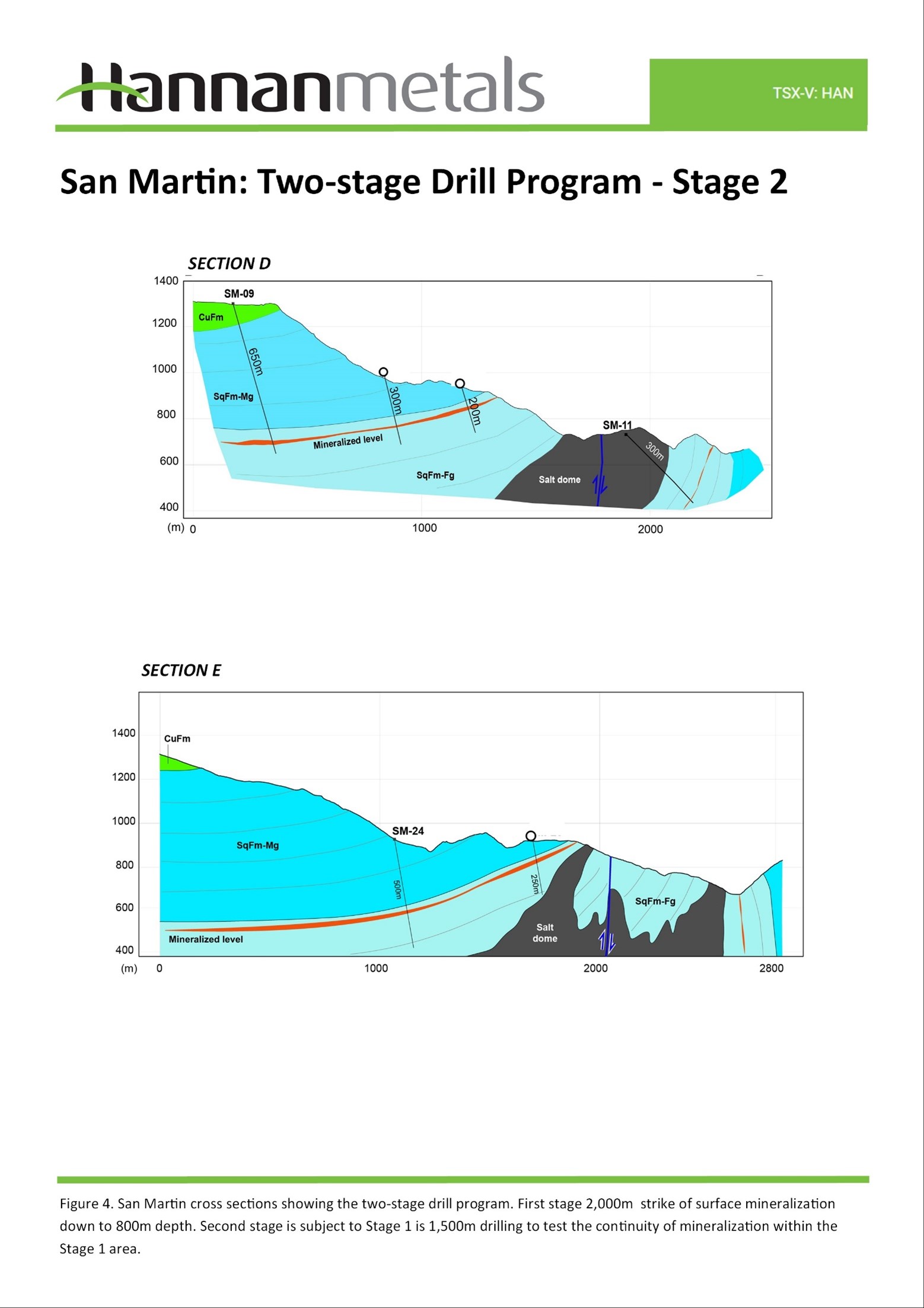 - First stage: A 2,000m diamond drilling program over a 2 km strike of mapped surface mineralization down to 800m depth (Figures 2 and 3).
