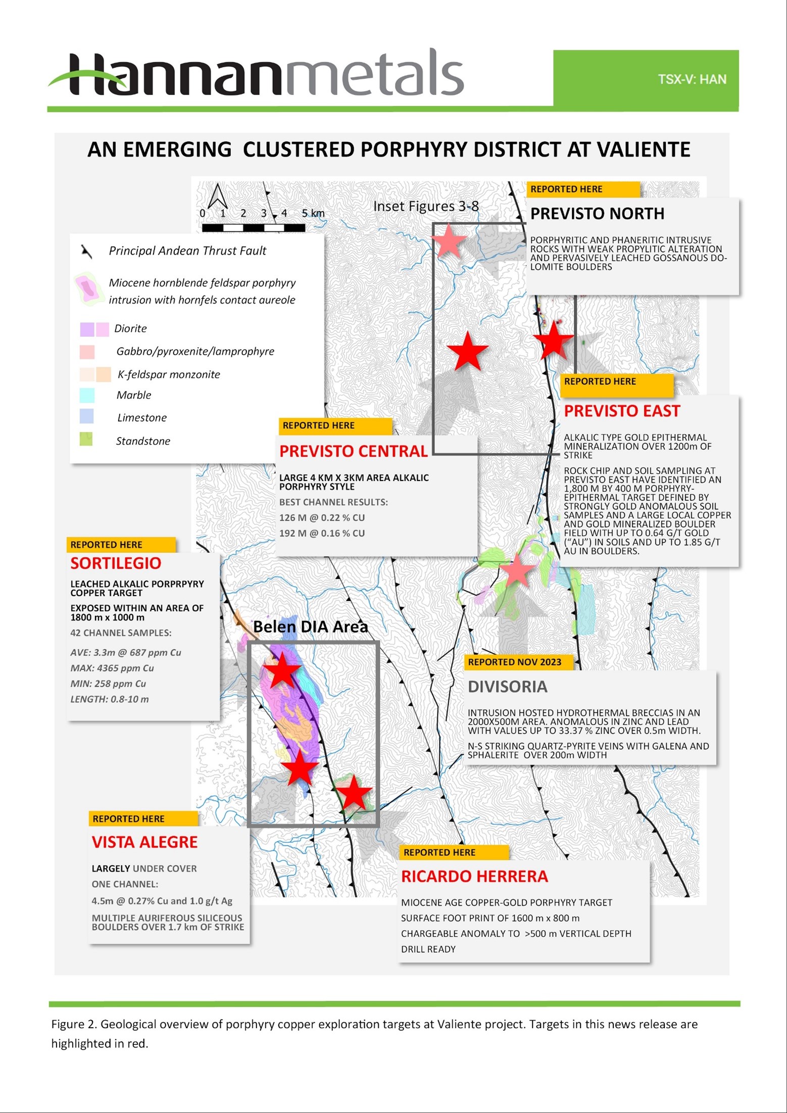 During 2021 Hannan staked and still holds 1,002 km2 of 100% owned mining concessions at Valiente covering unexplored terrain for potential mineralized porphyry targets in central eastern Peru. Early surface prospecting discovered two outcropping copper-gold porphyry targets and one epithermal target at Belen (see Press Release Feb 16, 2023) that is now being drill permitted (Figures 1 and 2). Porphyry discoveries quickly followed at Serrano Norte, Serrano and Pucacunga. The focus more recently has been on Previsto. At Previsto and Belen, a district-scale porphyry cluster within an area of 25 km by 10 km, with eight porphyry and/or epithermal targets now identified in more detail with up to 10 earlier stage targets awaiting further work.