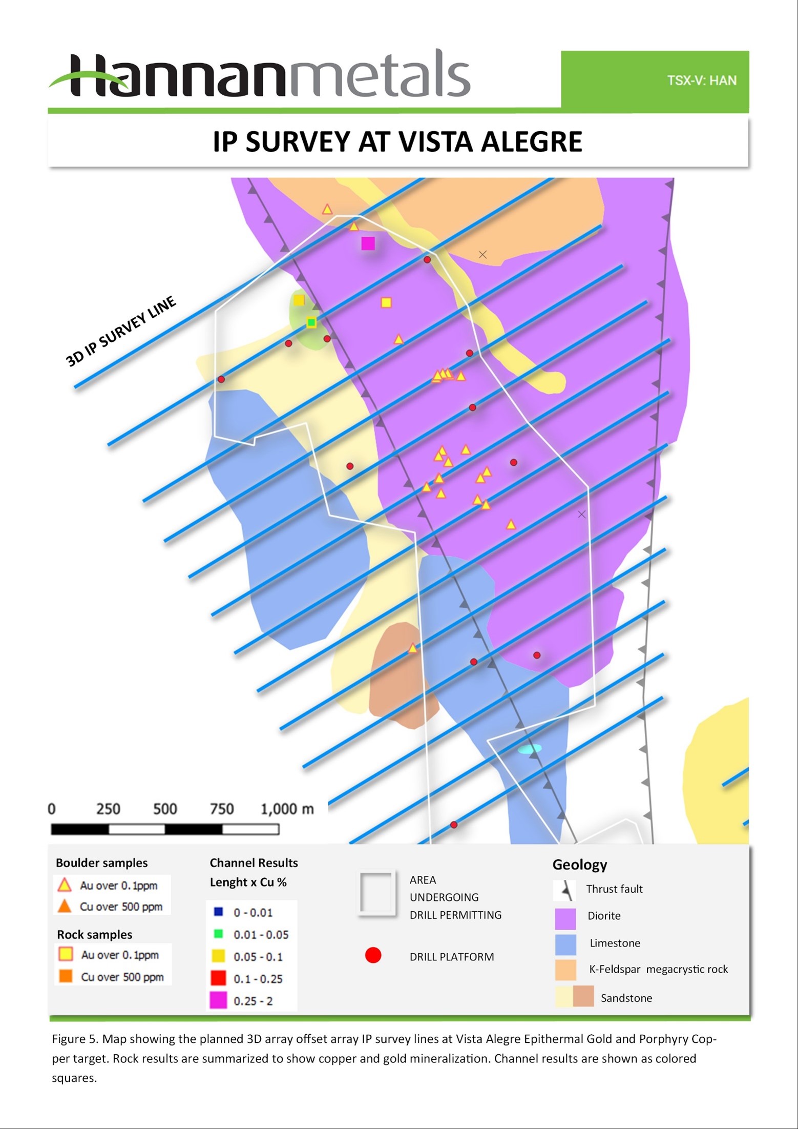 1. Previsto Central Copper-Gold Porphyry 2D survey: A 12.5 line km dipole-dipole IP survey transecting the very large 5 km x 3 km footprint of a porphyry mineralized system where the company has sampled 126 m @ 0.22% Cu (reported here) (Figure 3). 2. Previsto East Epithermal Gold 2D survey: A 2.5 line km dipole-dipole IP survey transecting the 1.8 km x 0.4 km wide strong gold-copper soil and boulder anomaly thought to represent a blind alkalic epithermal target (reported here) (Figure 3). 3. Ricardo Herrera Porphyry Copper 3D survey: A 28 line km offset array 3D IP survey crossing the Riccardo Herrera outcropping Miocene calc-alkalic porphyry target where copper mineralization on surface coincides with strong phyllic and intermediate argillic alteration over 800 m x 250 m. A 2D orientation survey in 2023 mapped the Riccardo Herrera porphyry to at least 500 m depth (reported here) (Figure 4). The survey covers the area where the company is currently permitting 14 drill platforms. 4. Vista Alegre Epithermal Gold and Porphyry Copper 3D survey: A 23 line km offset array 3D IP survey over the Vista Alegre multi-signature target with strong similarities to both high-sulphidation epithermal gold and porphyry copper mineralization. Sampling of soil and mineralized boulders has outlined a 1.7 km long gold trend with boulders assaying up 2.69 g/t Au (reported here). Surface mapping has also identified zones of porphyry related alteration with strong supergene overprint (Figure 5). The survey covers the area where the company is currently permitting 13 drill platforms. 5. Sortilegio Copper-Gold Porphyry3D survey: A 13 line km offset array 3D IP survey over the Sortilegio 1.8 km x 1 km alkalic porphyry target. The porphyry is cut by goethite veinlets stockworks where 26 channels averaged 3.3 m @ 687 ppm Cu and with a maximum of 4,365 ppm Cu and minimum of 258 ppm and high grade copper gold boulders assayed up to 16% Cu and 4.39 g/t Au (reported here) (Figure 6). The survey covers the area where the company is currently permitting 13 drill platforms.
