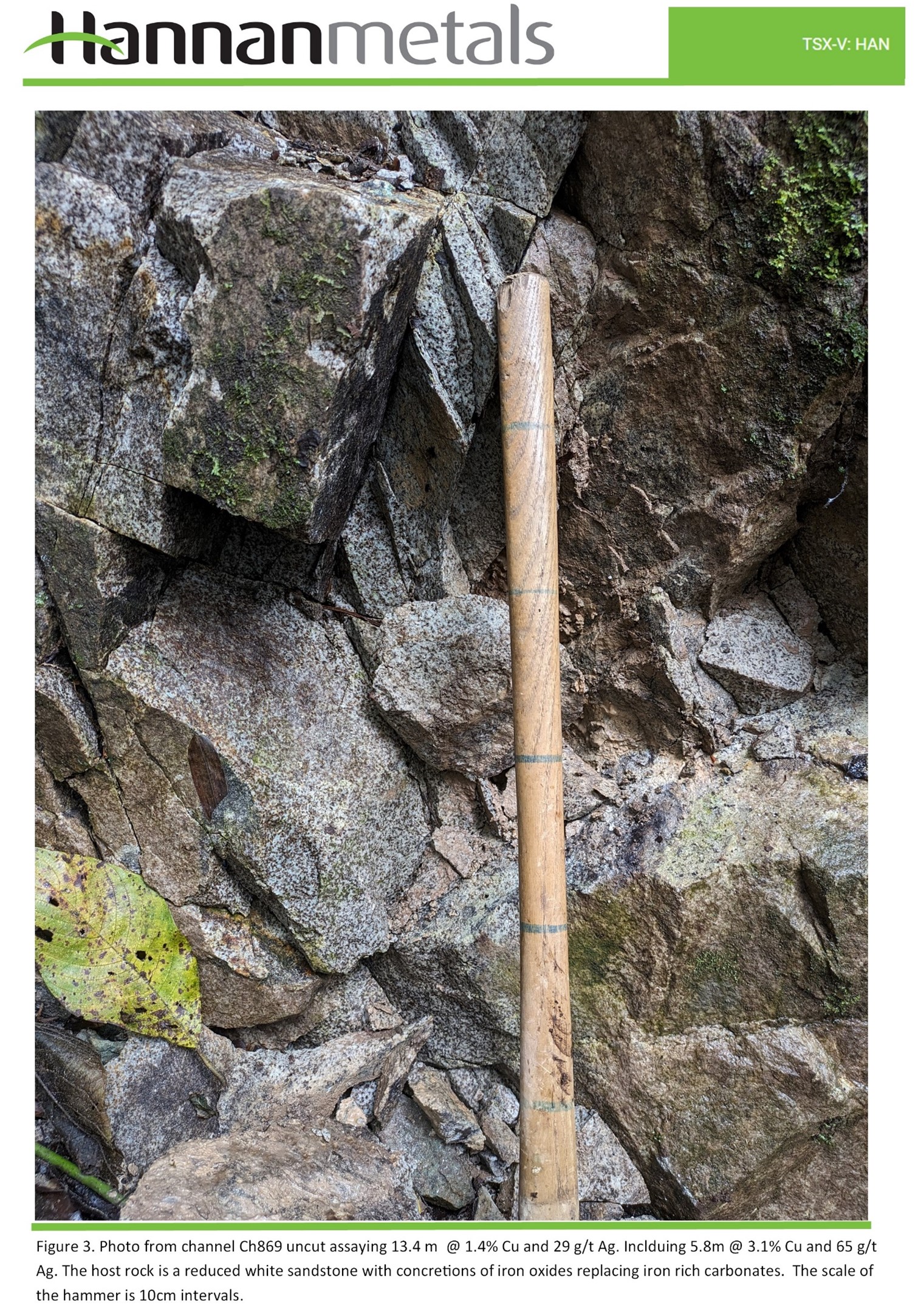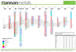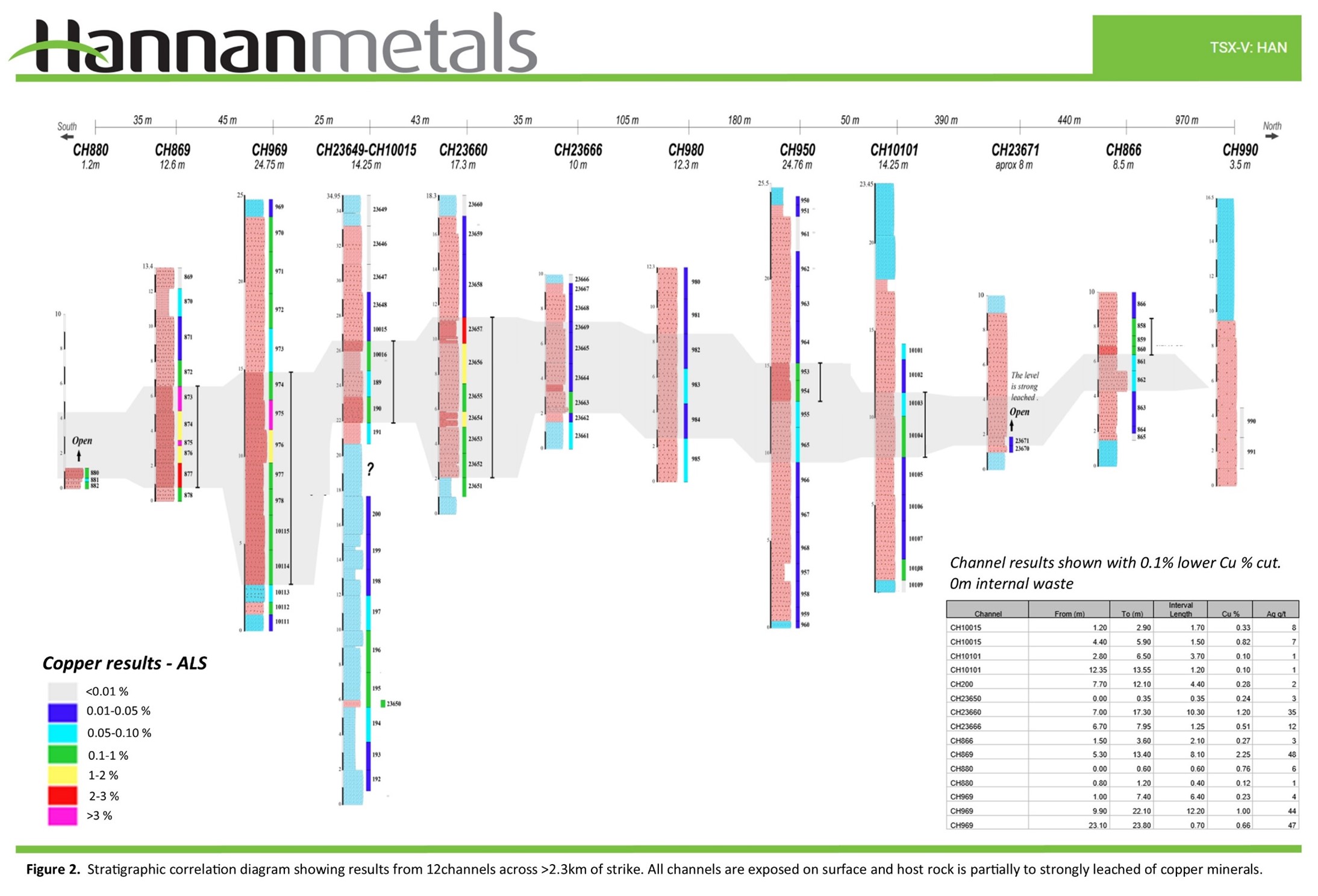 The mineralization is hosted by a 10 m to 30 m thick stratigraphic unit composed of medium to coarse grained sandstone and sedimentary breccia which has been traced for >2.3 km that remains open along strike to the North. Figure 2 shows a stratigraphic correlation diagram showing results from the 12 channels across >2.3 km of strike. All channels are exposed on surface and the host rock is partially to strongly leached of copper minerals.