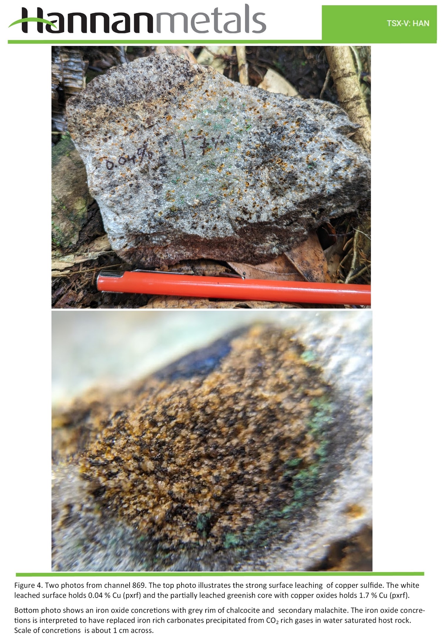 - Copper mineralization is locally high-grade and chalcocite dominant. Surface outcrops are strongly leached (Figures 3 and 4) suggesting higher-grade copper mineralization may exist below the weathered surface outcrops.