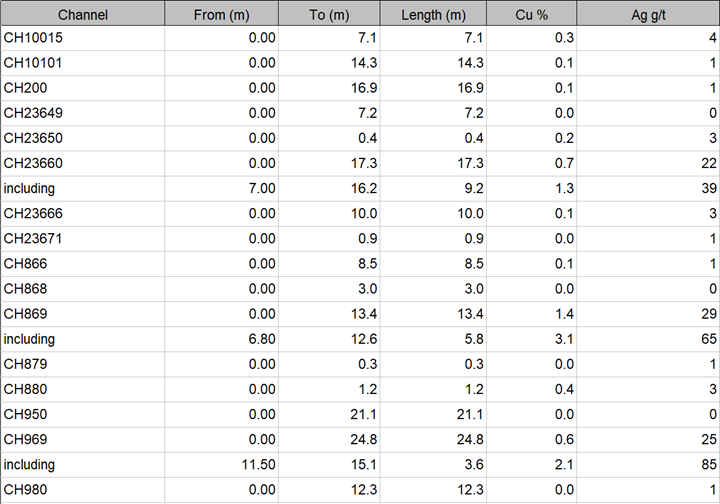 Table 1 Channel results shown with 0.1% Cu lower-cut with higher grade intervals 1.0% Cu lower cut