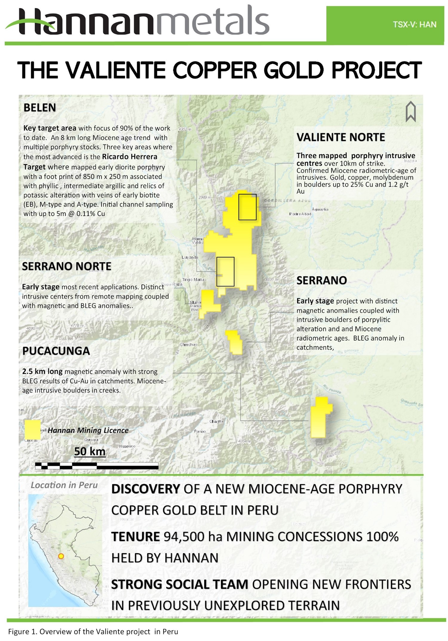 The Belen Cu-Au porphyry is located 19 km east from the township of Tingo Maria in central Peru, within a previously unknown Miocene-age porphyry-epithermal copper-gold mineralized belt. The Belen project is contained within a 140 km by 50 km area, named the Valiente Project, where Hannan's exploration team has identified at least seven intrusion related porphyry/epithermal/skarn targets, of which Belen is the most advanced and described here in more detail (Figure 1).