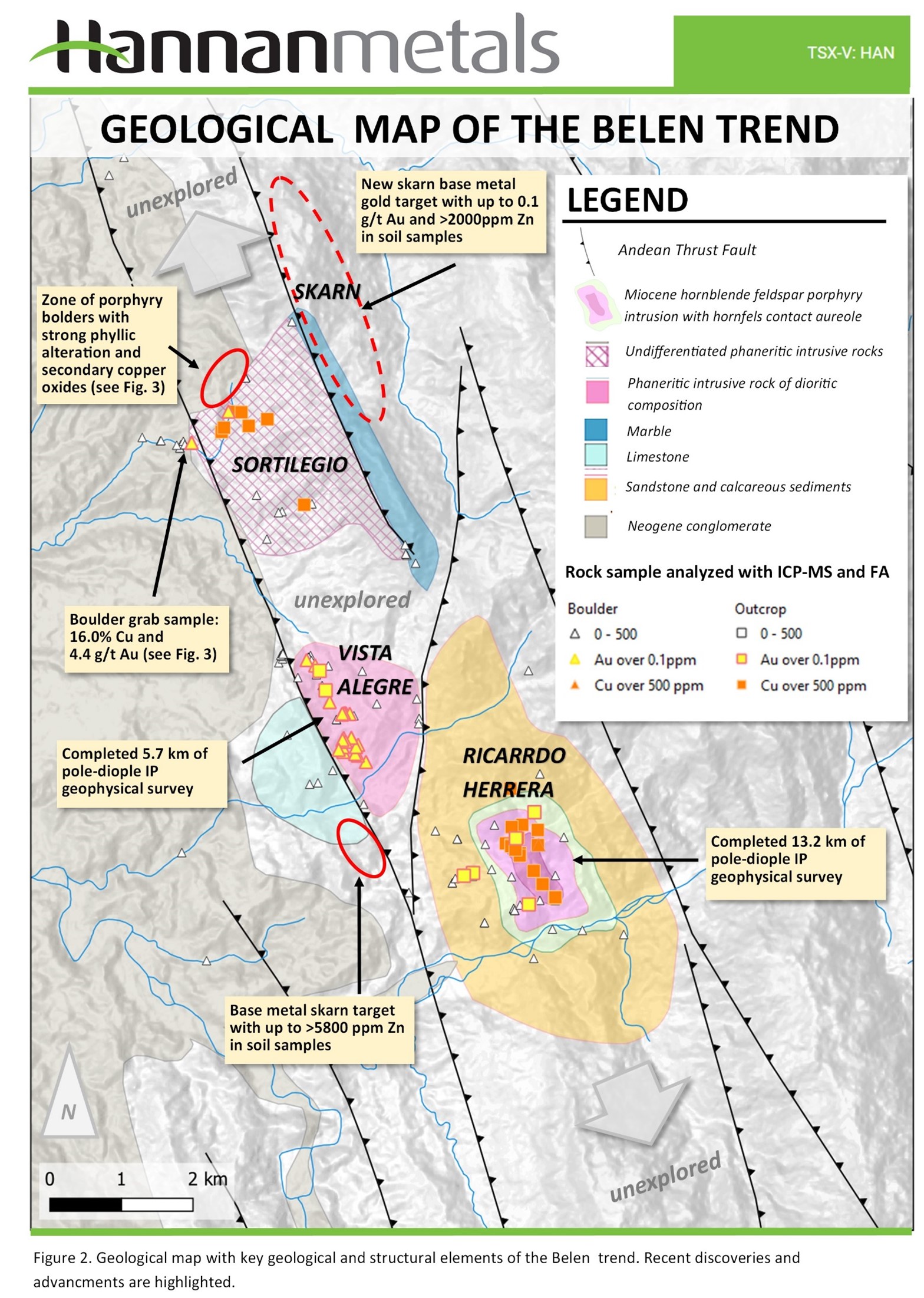Michael Hudson, CEO, states: "Despite the political challenges Peru has seen over the last months, Hannan's teams have remained very active in the field with positive interactions with local stakeholders continuing. Momentum at Valiente remains high. The work by our field team continues to successfully expand and refine the mineral system at Belen. The high-grade copper gold boulders at Sortilegio, within the Belen trend, demonstrate the potential of a new high-grade target at Sortilegio and importantly, we are now mapping mineralization over a large footprint. This is highlighted by the development of the 4 km long base metal gold skarn target east of Sortilegio within the 10 km long linked porphyry copper-gold and epithermal gold mineral system. With permissions received to commence our detailed drill permitting, we look forward to 2023 with great enthusiasm."