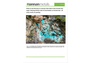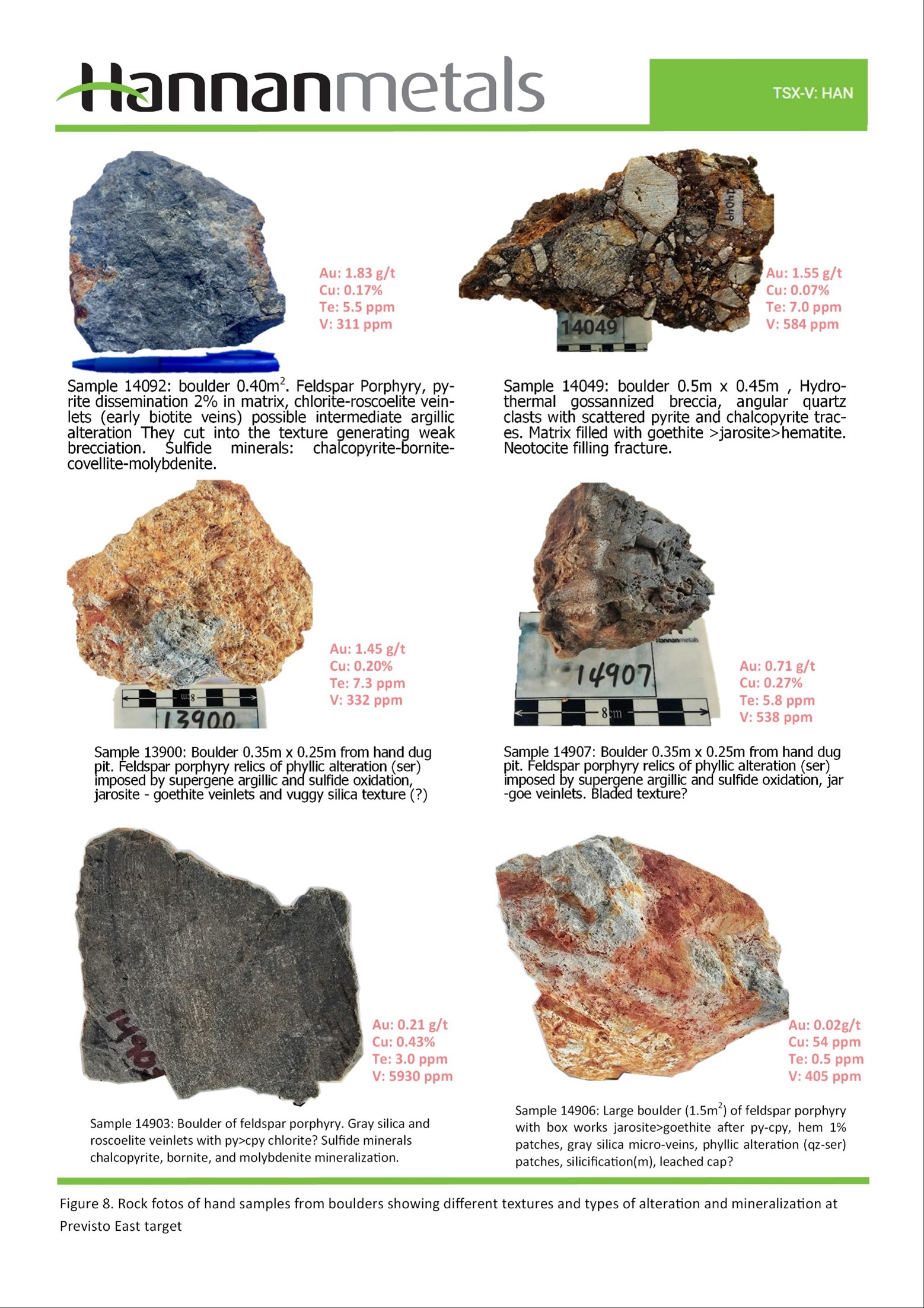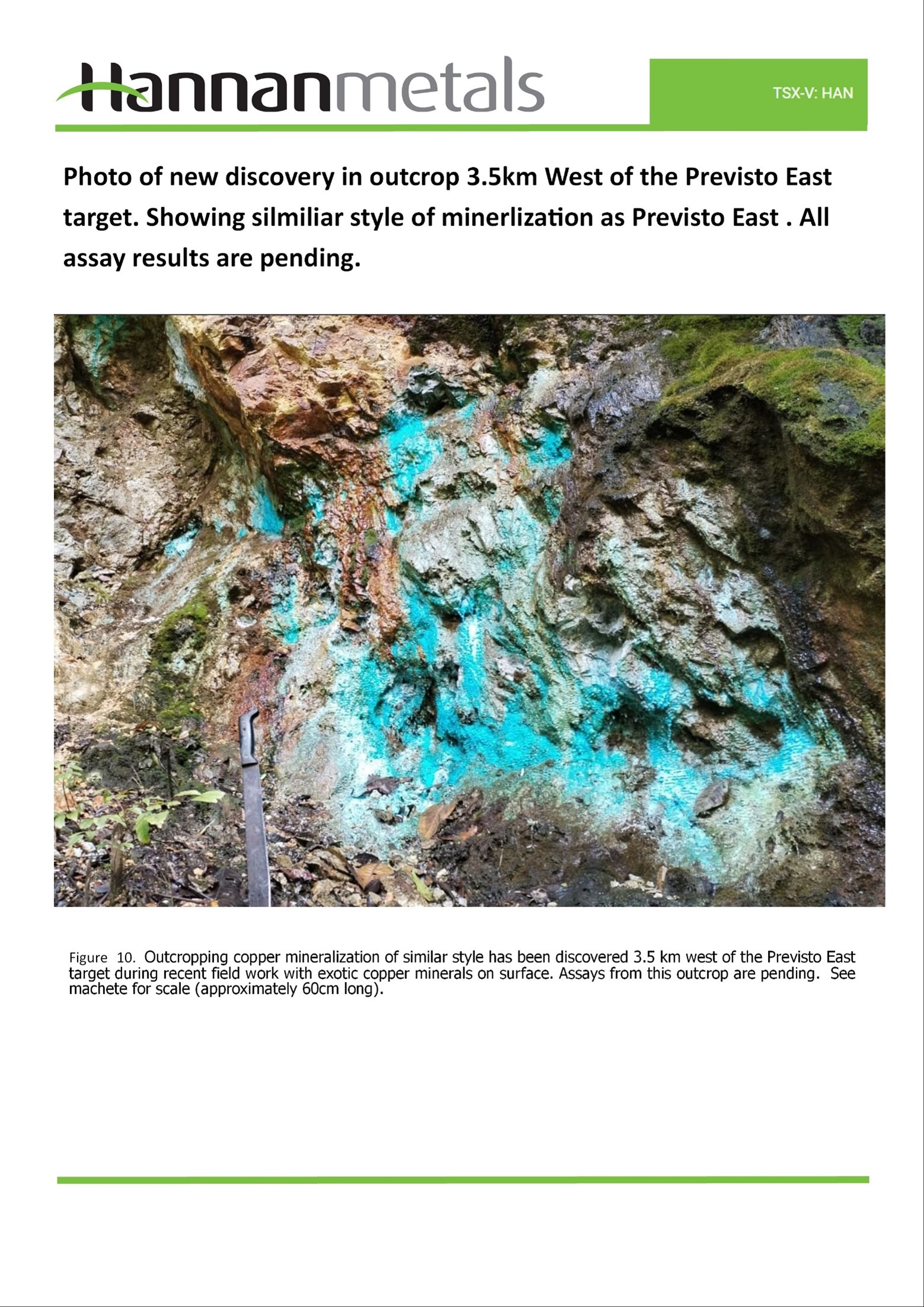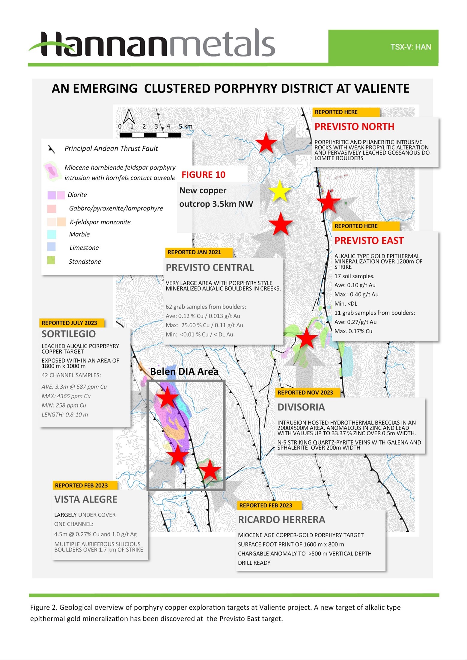 Michael Hudson, CEO, states: "Hannan's 100%-owned Valiente project keeps getting better with our teams expanding and making new discoveries every month. The scale of the Previsto East gold-rich copper porphyry system identified here competes with some of the best pre-discovery stage porphyry projects. The larger Previsto area remains largely unexplored, and our teams are now actively expanding the footprint to identify additional copper and gold rich targets adjacent to Previsto East. Excitingly early-stage prospecting has identified large outcrops of copper oxide mineralization of a similar style 3.5 km west of the Previsto East target during recent field work. We believe our work is demonstrating a giant porphyry cluster with the footprint likely to expand with further mineral prospecting during 2024."