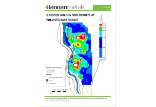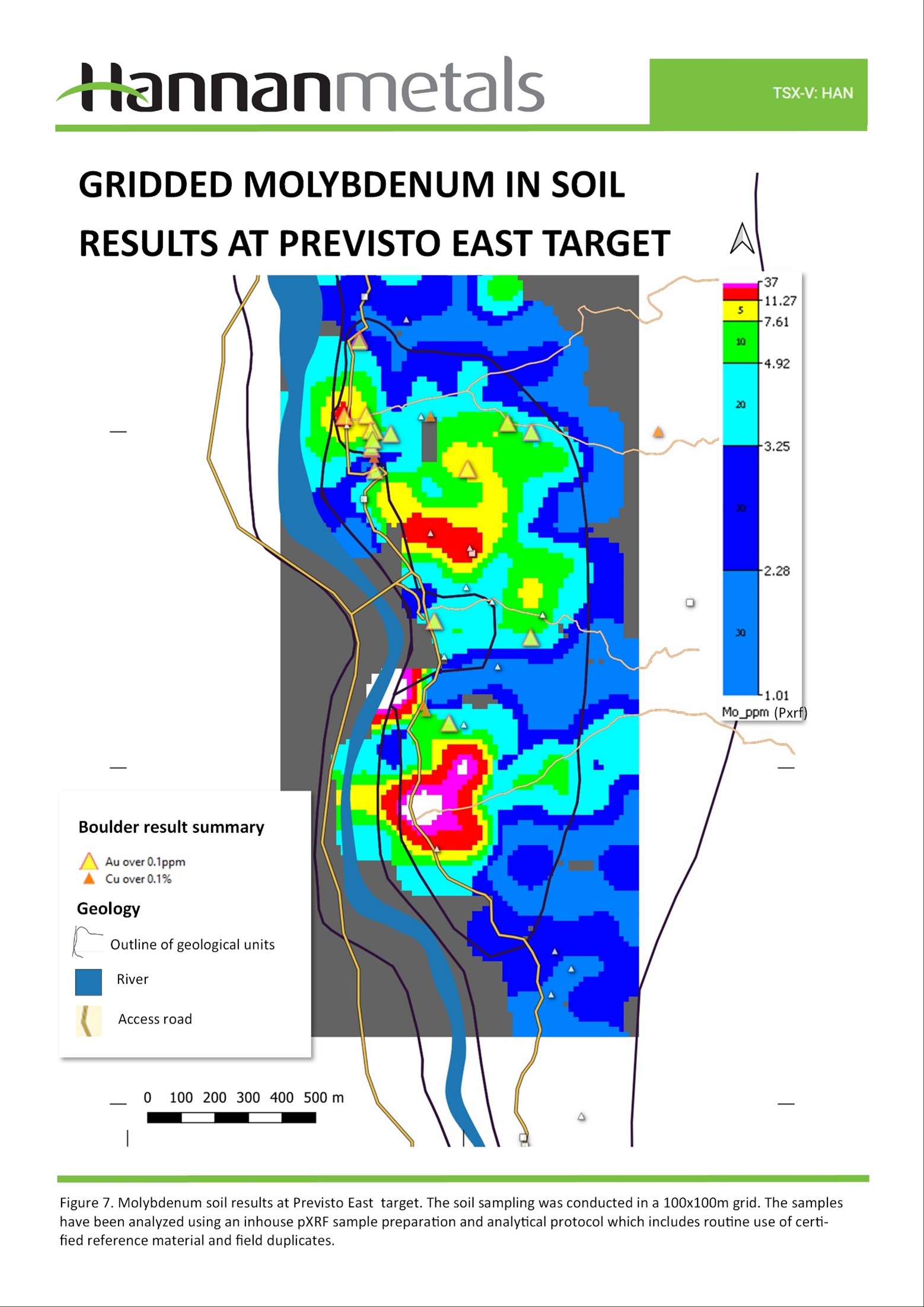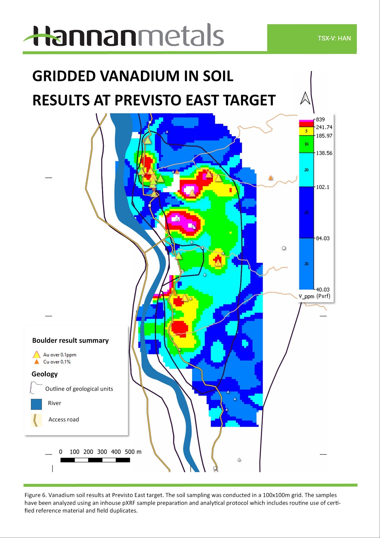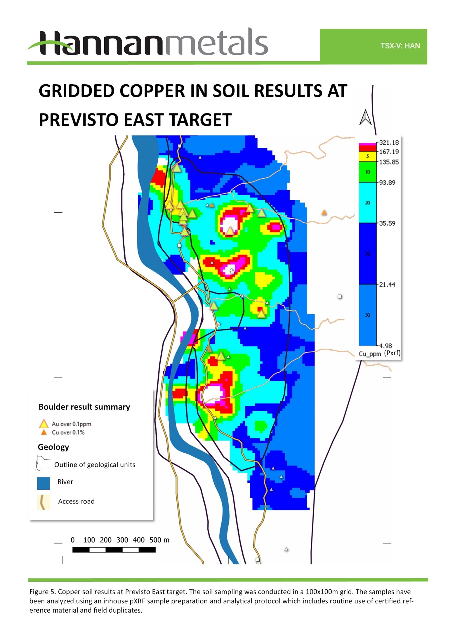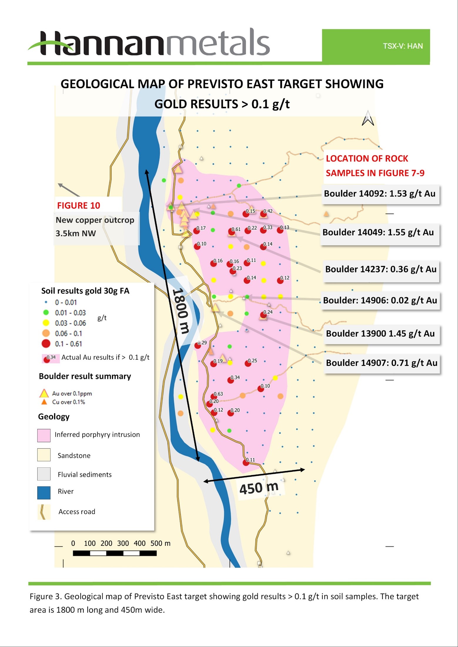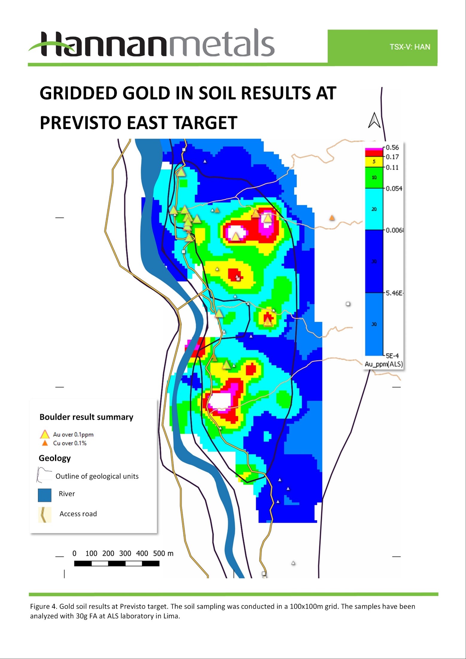VANCOUVER, BC, April 10, 2024 (Newswire.com) - ("Hannan" or the "Company") (TSXV:HAN)(OTCPK:HANNF) surface sampling at the 100%-owned Valiente project in Peru has identified an 1,800 m by 400 m alkalic porphyry-epithermal target. The discovery, named Previsto East, contains anomalously high gold in soil samples, associated with multiple large local copper and gold mineralized boulders, in an area covered by scree and soil cover from 1 m to 5 m thick.