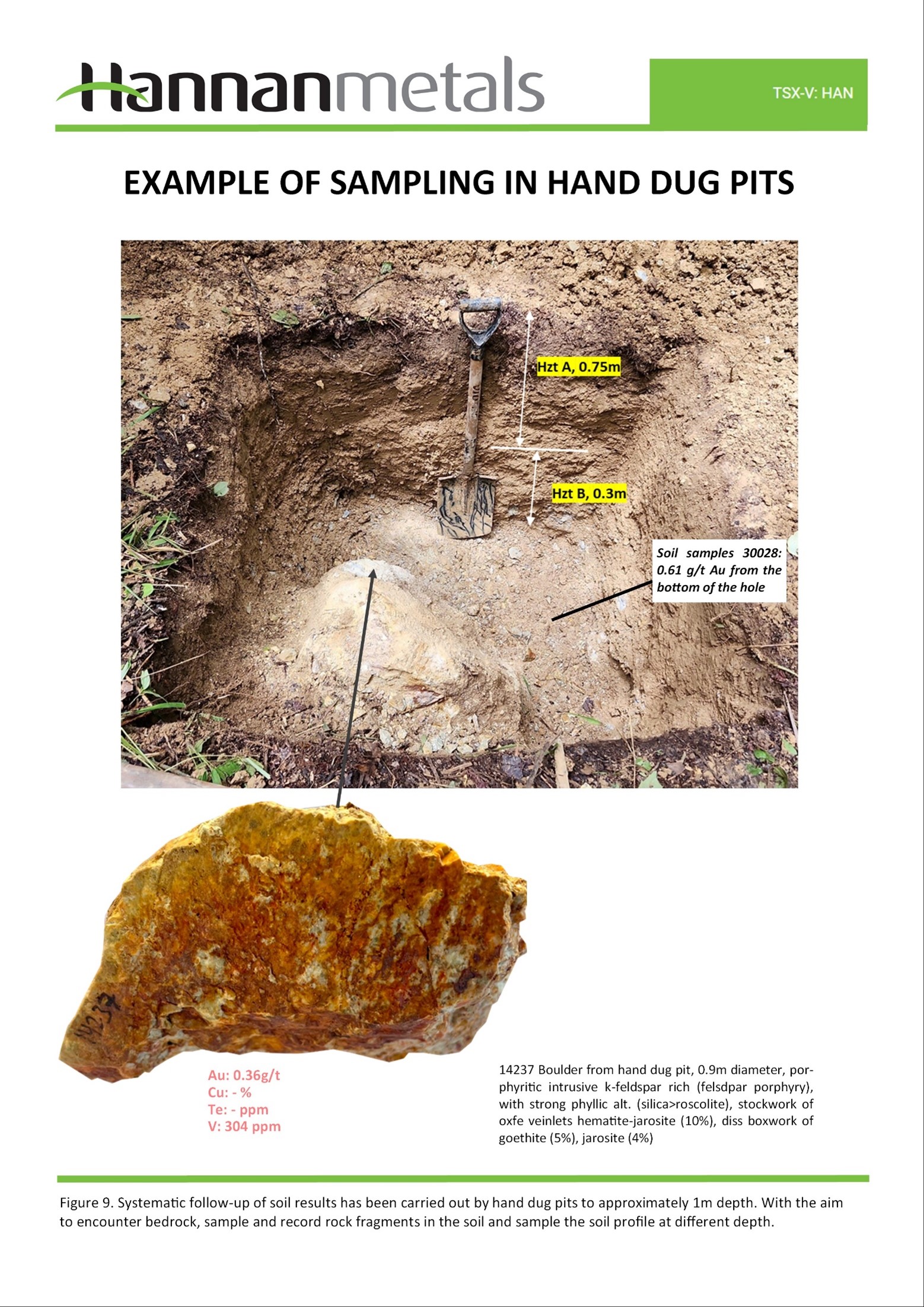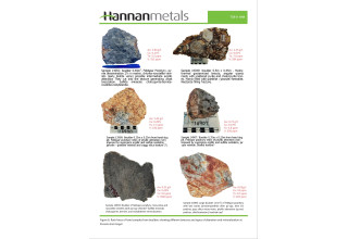 All samples were collected by Hannan geologists. Samples were transported to ALS in Lima via third party services using trackable parcels and by company staff. At the laboratory, rock samples were prepared and analyzed by standard methods. The sample preparation involved crushing 70% to less than 2 mm, riffle split off 250g, pulverize split to better than 85% passing 75 microns. Samples were analyzed by method ME-MS61, a four-acid digest preformed on 0.25g of the sample to quantitatively dissolve most geological materials. Analysis is via ICP-MS. Channel samples are considered representative of the in-situ mineralization samples and sample widths quoted approximate the true width of mineralization, while grab samples are selective by nature and are unlikely to represent average grades on the property. Gold was analyzed in rock and soils by ALS in Lima using a standard sample preparation and 30g fire assay sample charge. Soil samples were analyzed by a portable XRF (VANTA-VMR) using an inhouse protocol which includes routing use of CRM and field duplicates as well as 10% check samples analyzed by ALS Lima.