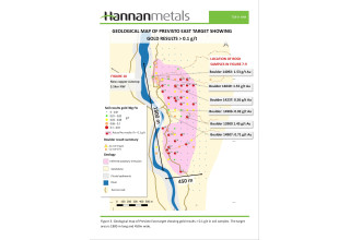 Rock chip sampling at Previsto East as identified an 1,800 m by 400 m porphyry-epithermal target defined by strongly gold anomalous large local copper and gold mineralized boulder fields with up to 1.85 g/t Au in boulders. A total of 84 rock samples from large local boulder fields and boulders in metre deep pits ranged from 1.85 g/t Au to 0.001 g.t Au, and averaged 0.15 g/t Au and 0.73% Cu to 0.01 % Cu and averaged 0.08 % Cu (Figure 2).
