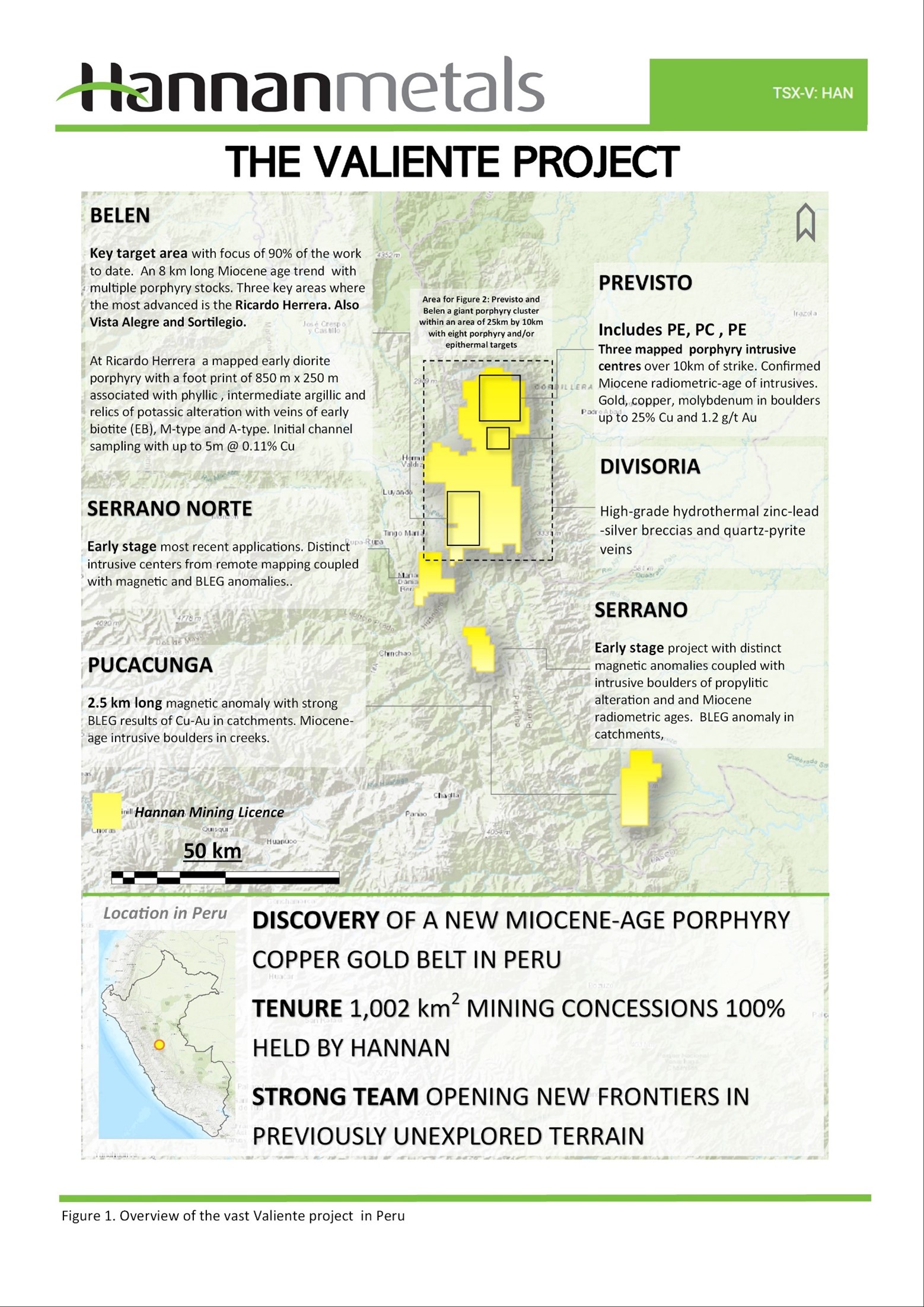 The 100% owned Valiente project is in central eastern Peru, east of the city of Tingo Maria (Figures 1 and 2). The area is characterized by steep topography on the eastern flank of the Central Cordillera with elevations between 800 m and 2,000 m above sea level (a.s.l.). The project was discovered in 2021 during an extensive greenfields exploration program initiated by Hannan. Hannan holds 1,002 sq km of mineral tenure prospective for back-arc porphyry copper-gold systems at the Valiente Project in central eastern Peru. The company has been actively exploring the project since 2021 and successfully gained social permits all areas of interests in the zone. In January 2024 Hannan submitted it first drilling application (DIA) covering two porphyry targets and one epithermal target at the Belen zone (click here for news release). The company is now expanding the footprint by exploring new areas to build a pipeline of projects that will be permitted, and drill tested over the coming five years.