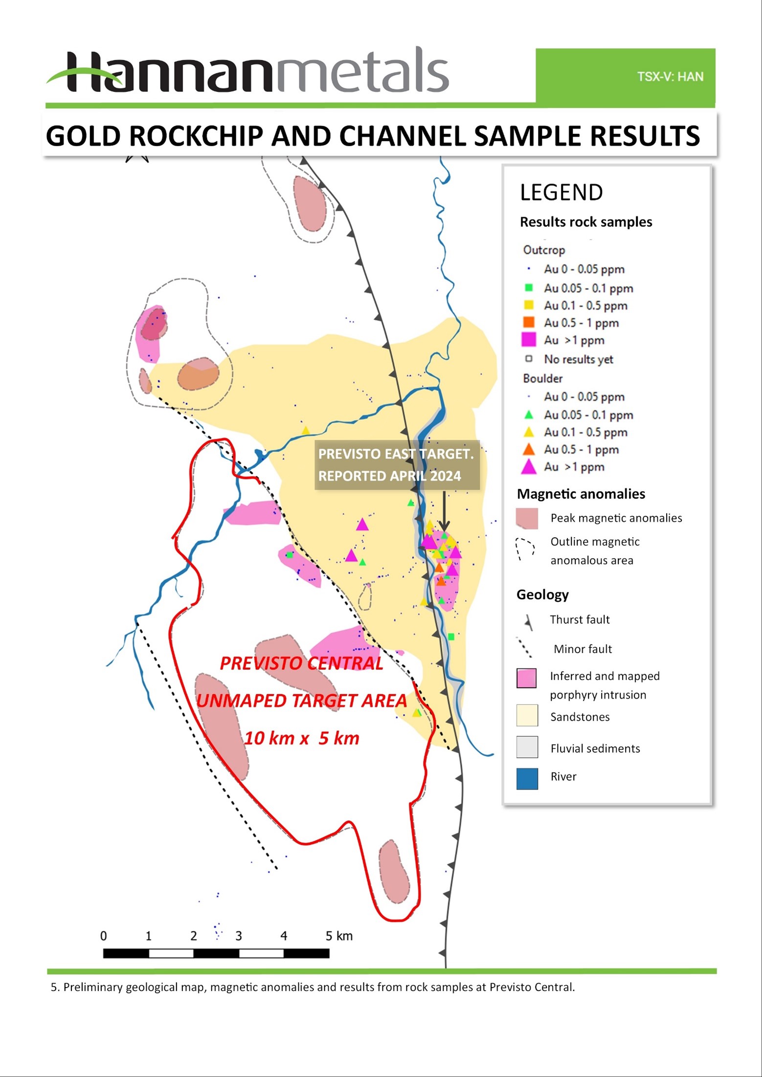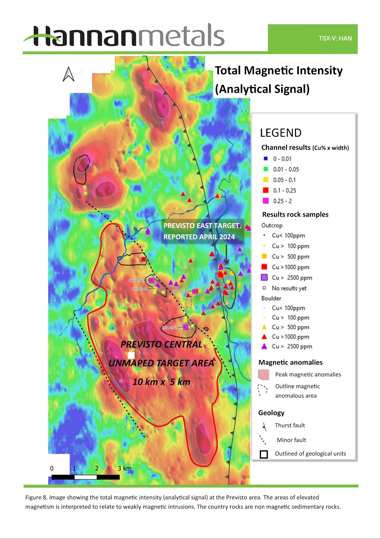 - Scale: The new discovery coincides with a 10 km x 5 km large airborne magnetic and radiometric potassic anomaly (Figures 8 and 9). Mapped mineralization at Previsto is associated with areas of elevated magnetic and potassium. The footprint of the combined magnetic and potassic anomaly is considered significant on a global scale.