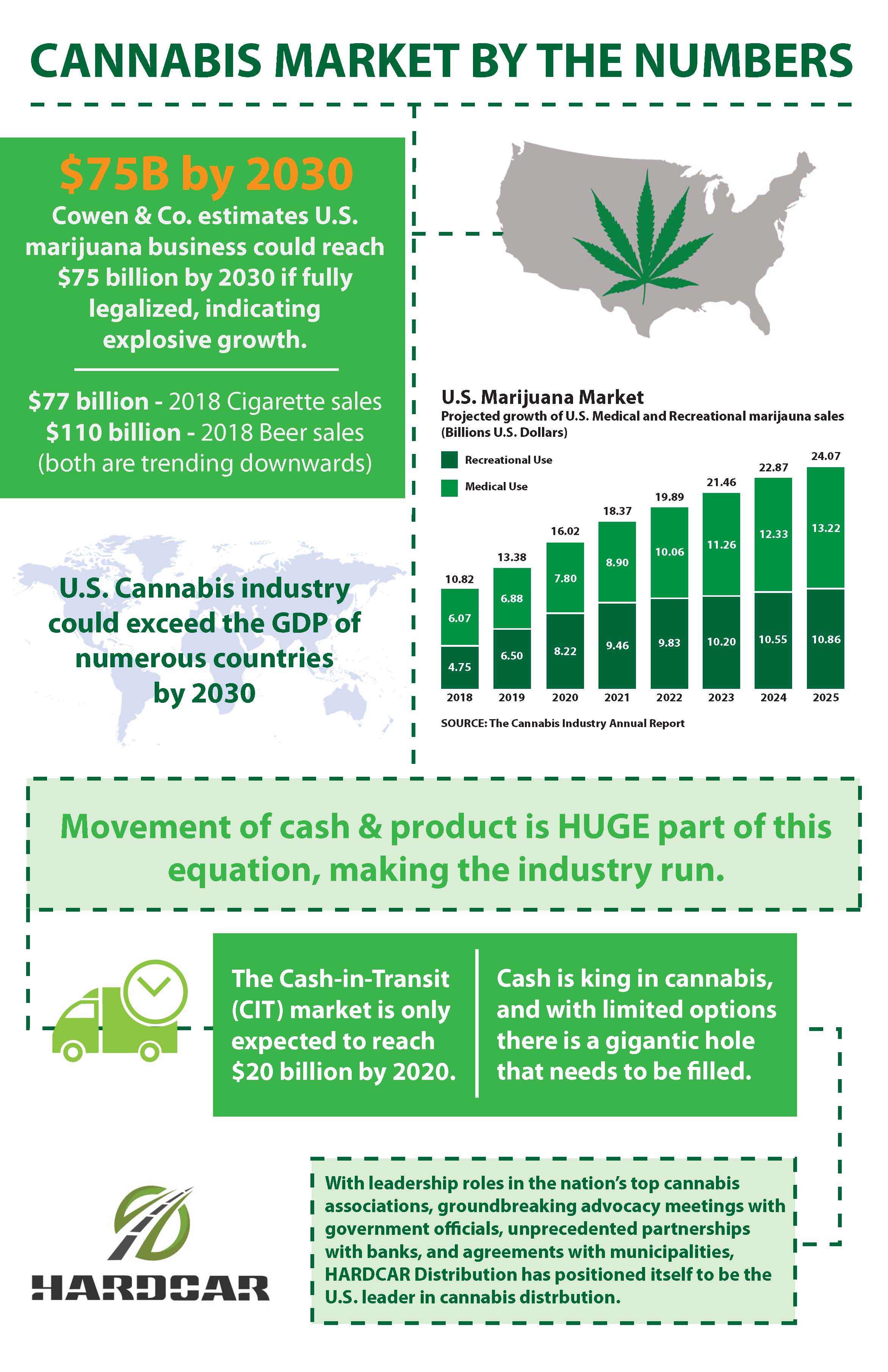 A recent report by Cowen & Co. shows that the U.S. legal cannabis industry could reach $75 billion in sales by 2030, surpassing the annual sales of carbonated soft drinks, beer and cigarettes. Movement of cash & product is a major part of this equation, making the industry run. With leadership roles in the nation’s top cannabis associations, groundbreaking advocacy meetings with California’s government officials, unprecedented partnerships with Federal Banks, and agreements with municipalities, HARDCAR has positioned itself as an industry leader in the U.S. cannabis market.