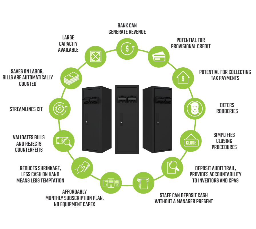 "The Smart Cash Deposit Vault provides peace of mind for operators and their investors. We automate all cash counting to simplify closing, reduce labor costs and provide a detailed cash audit trail." - Andrew Savala, Owner / CEO of Cannabis Cash Solutions