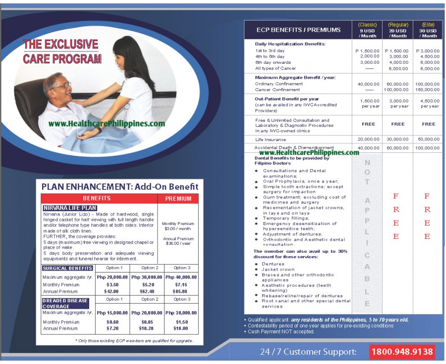 HealthcarePhilippines.com details that for a Plan price ranges of $9, $20 and $30 per month, holders and beneficiaries of the Exclusive Care Program for Filipinos can enjoy wide insurance coverage, including Hospitalization and In-patient Services, Emergency Room Care Services, Preventive Health Care and Out-patient Services.