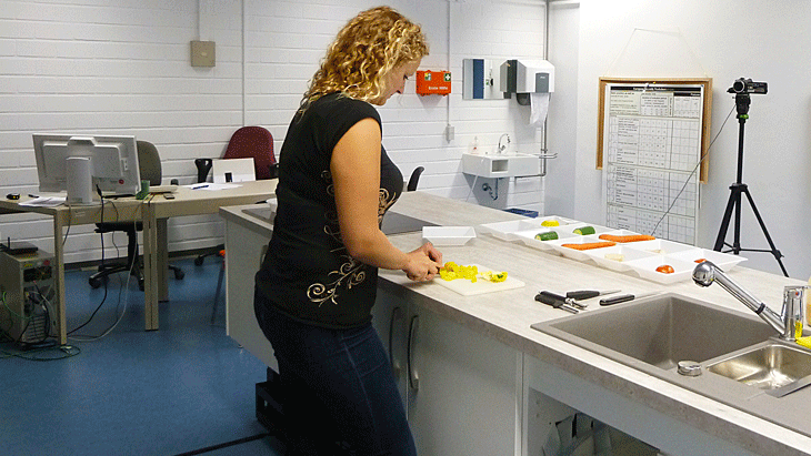 That is the theory. However, how does it work in practice? What experiences have users of an electric height adjustable worktop? How do they feel the theoretically calculated gain in comfort? To answer these questions, 59 volunteers were asked to prepare a salad at a cooking island with an electrically adjustable worktop. Therefore, they had to cut, rinse and wash. The persons were first to work at a fixed ergonomic height.