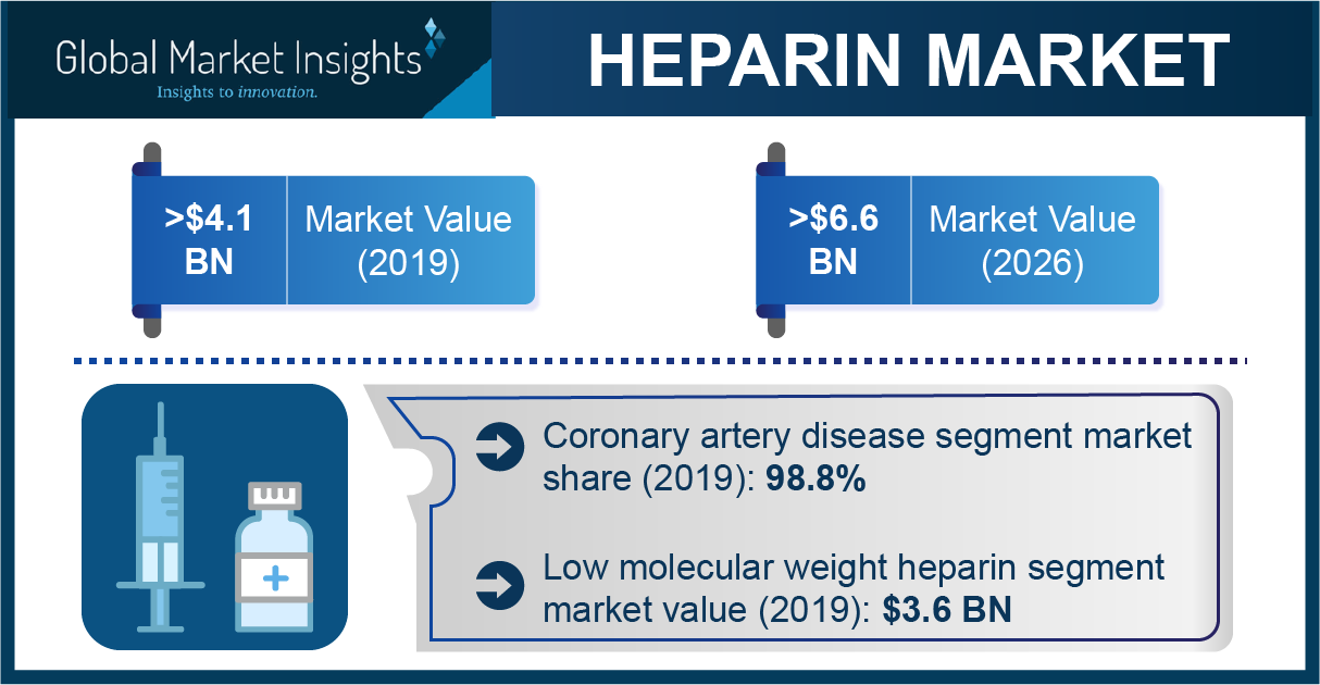 SELBYVILLE, Delaware, October 15, 2020 (Newswire.com) - According to the latest report “Heparin Market by Product (Low Molecular Weight Heparin, Unfractionated Heparin), Source (Porcine, Bovine), Application (Venous Thromboembolism, Atrial Fibrillation/Flutter, Coronary Artery Disease), Distribution Channel (Hospital Pharmacy, Retail Pharmacy, Online Pharmacy), Regional Outlook, Price Trends, Competitive Market Share & Forecast 2026”, by Global Market Insights, Inc., the market valuation of heparin will cross $6.6 billion by 2026.