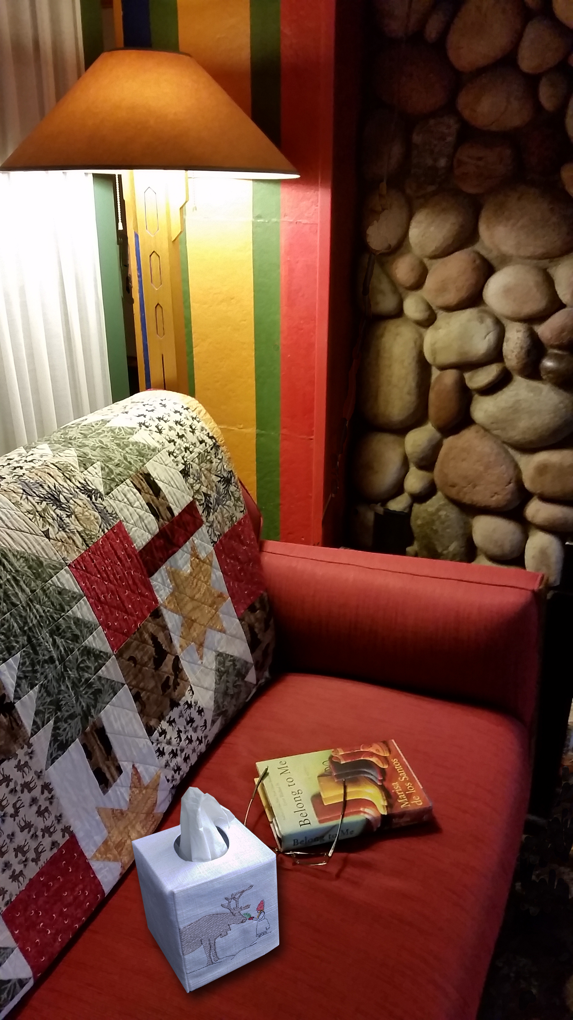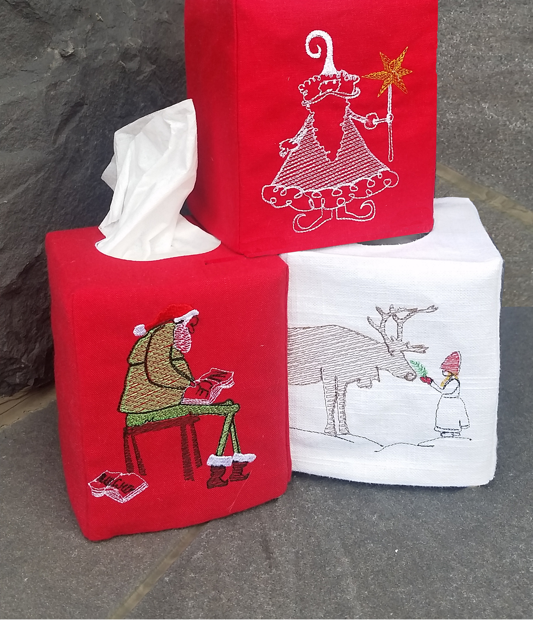 The idea for Herdoso tissue boxes began during a visit to my mother while she was in intensive care. We searched for a perfect gift - - - tough, since the IC unit didn't allow flowers, she was in no condition for candy, and she didn't need anymore "stuff". The inspiration was staring at me in the face: that ugly tissue box ubiquitous on every hospital tray. A cover embroidered with encouraging words and images came into being and mom loved it.