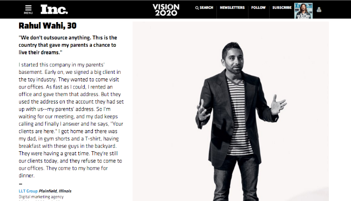 Chicago, IL, November 10, 2015 (Newswire.com) - FASTER. YOUNGER. STRONGER – Rahul Wahi, Agency Principal of LLT Group, Inc., one of the fastest growing startup’s in the space receives the highest accolade by being the youngest on the Rising Stars list of Inc. Magazine’s 2015 rankings. In October named #92, of the fastest growing private companies on the Inc. 5000 list, today Rahul Wahi has grown LLT Group to a pinnacle level of success.