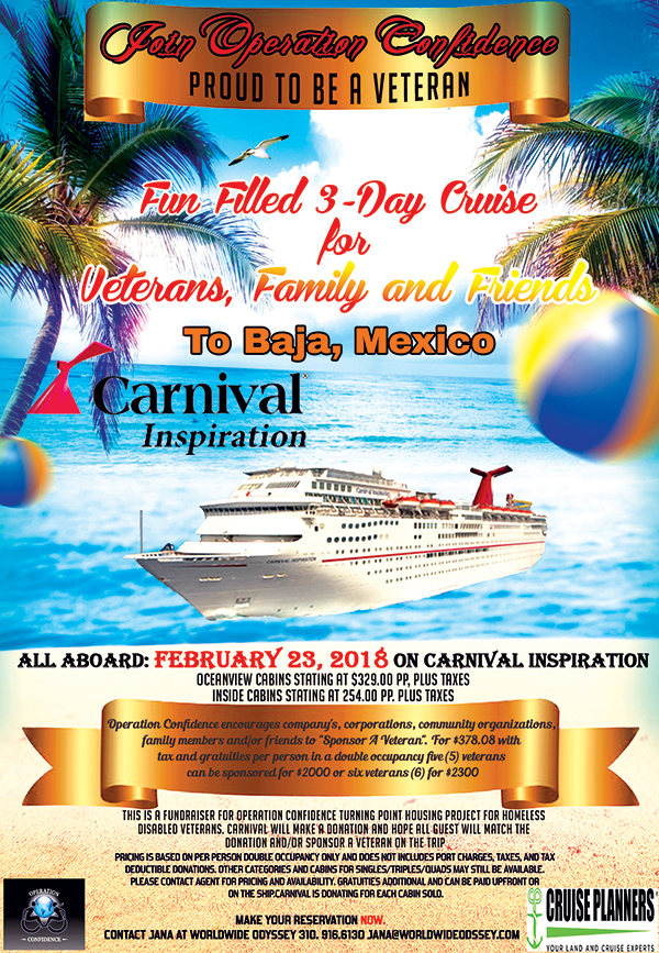 To be announced at the event will be Operation Confidence's 2018 Carnival Cruise, a Veterans and Civilians 3-Day Party Cruise to Baja, Mexico leaving Los Angeles on February 23, 2018. Five (5) veterans can be sponsored for $2000 and (6) for $2300 in the same category. For additional information please contact: [email protected] or call (818) 282-4916.