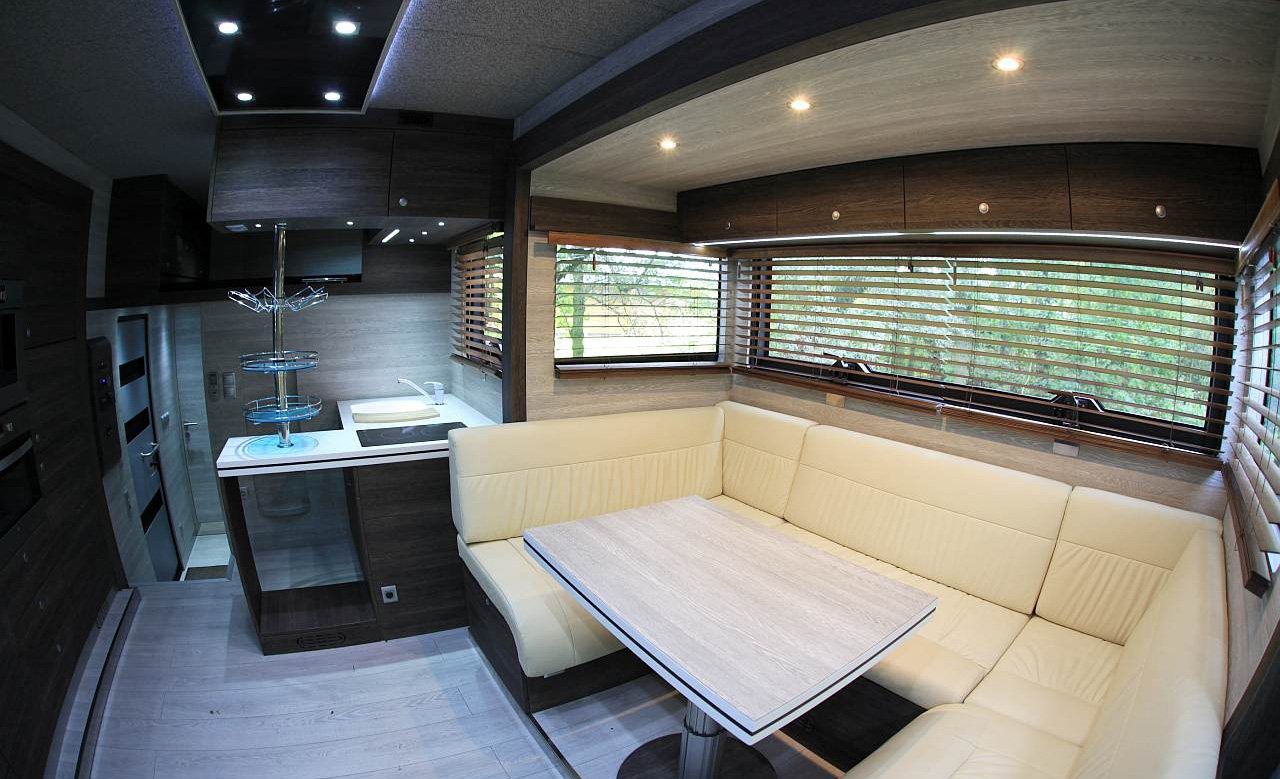 Notably, Rudvan horse trucks are actual apartments on wheels that are built using only the highest quality materials and appliances. Various compositions of wood colours, modern decoration details, stainless steel, conglomerated, natural stone, glass, natural ceramics, materials and smooth or chamois leather are all offered to suit the client's requirement. A variety of interiors and additional features are also offered to clients.
