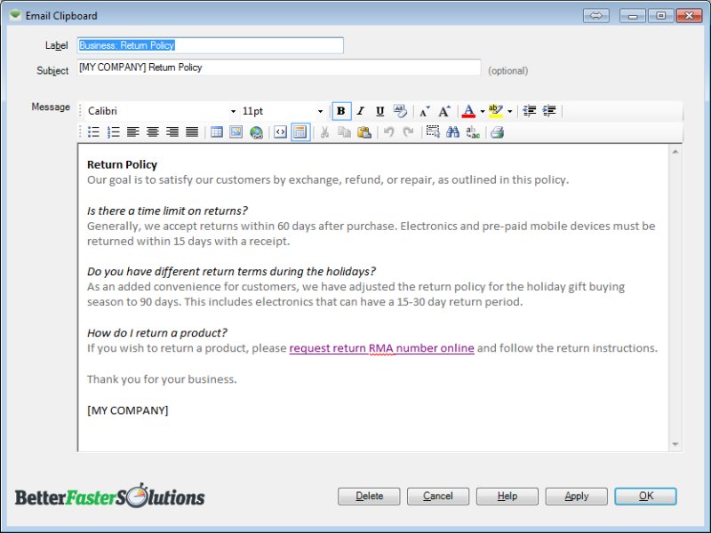 WESTERVILLE, Ohio, August 28, 2018 (Newswire.com) - In April this year, Microsoft Outlook introduced Suggested Reply for emails using Artificial Intelligence (AI). However, what if the AI suggestion isn't what the customer wants? What's the alternative? The answer is Better Faster's Clipboard for Outlook. Better Faster Solutions, a registered Microsoft® software partner, today released Clipboard for Outlook, a Microsoft Outlook® add-in. It allows customers to craft better email responses and reply with the click of a button. Better Faster Clipboard offers more than just email replies. It may save three weeks or more each year on routine Outlook tasks, according to Better Faster Solutions customer research.