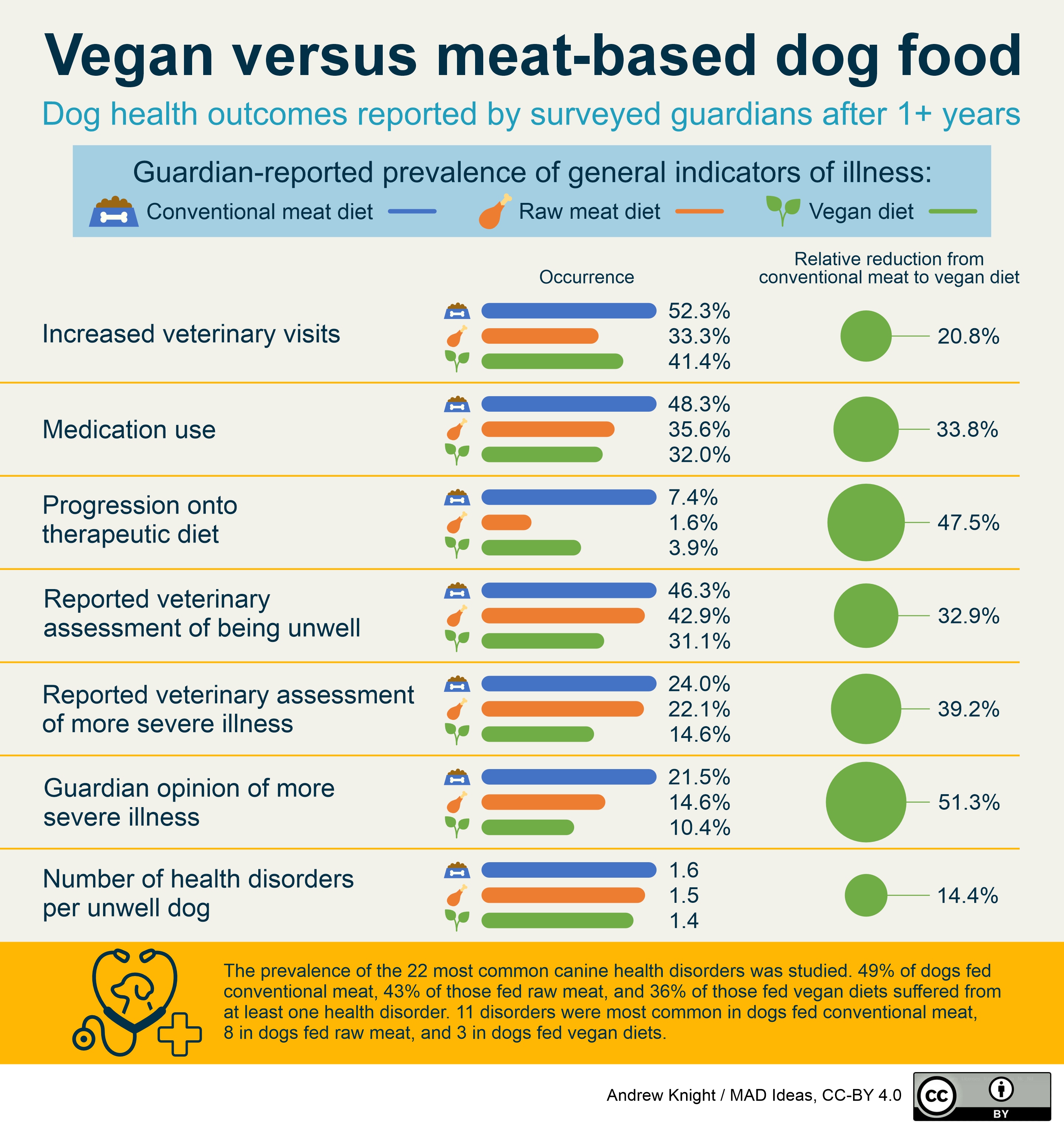 Among the 22 most common health disorders found in a 2022 study of the same dogs, 11 were most common in dogs fed conventional meat, eight in dogs fed raw meat, and three most common in dogs fed vegan diets. 49% of dogs fed conventional meat were unwell, compared to 43% fed raw meat, and 36% fed vegan diets.