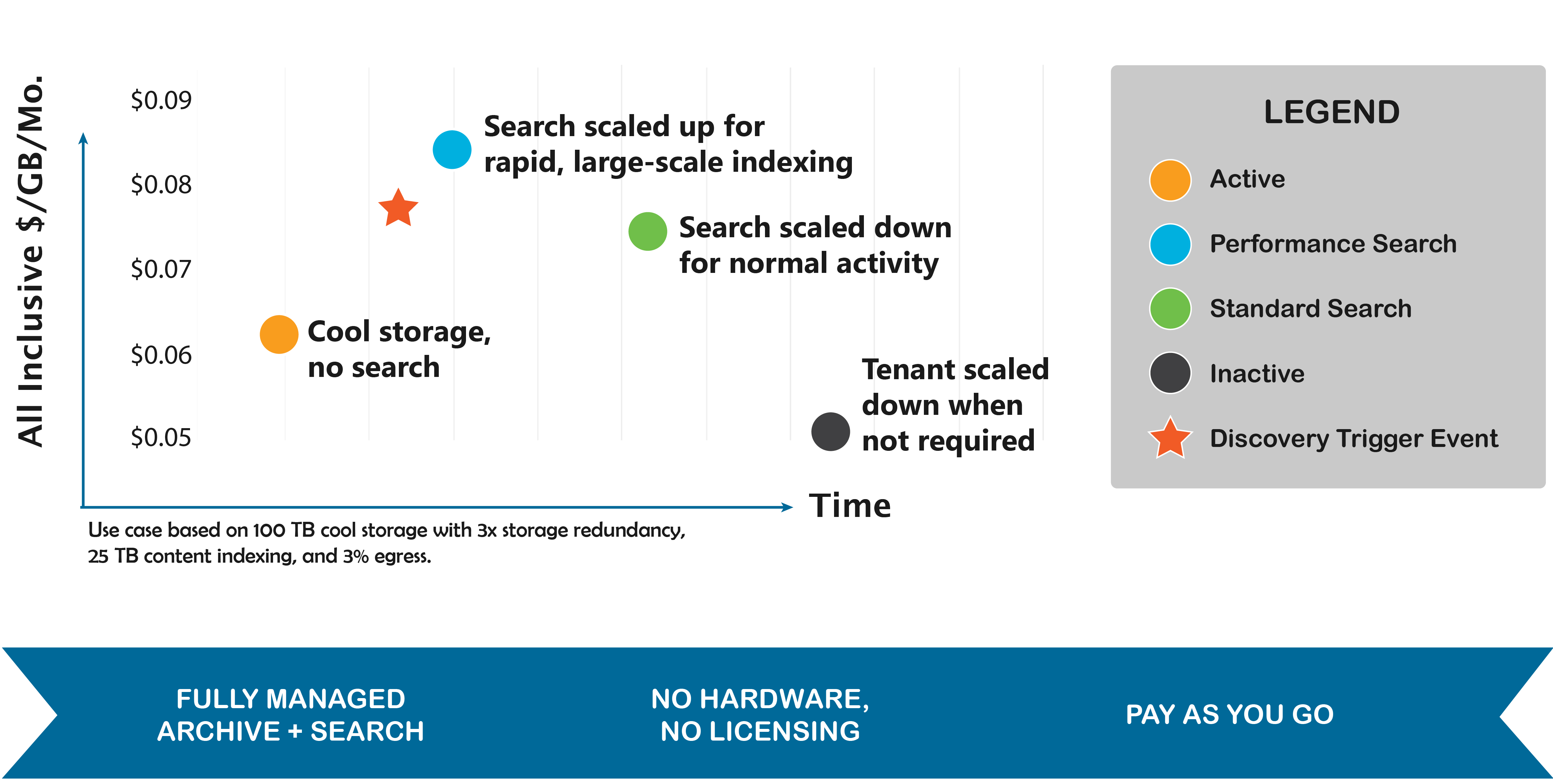 While enterprises increase their adoption of the cloud, such as moving email workloads to Microsoft Office 365, there is often the realization that significant amounts of data held in on-premises storage is orphaned – the owner of the data is no longer at the organization. This presents a unique challenge – not only for email but for files and other types of unstructured data too – because the organization has no easy mechanism to store and manage it, and it is often unclear when deletion can occur. CoolSearch addresses these issues by providing a fully managed cold storage archive that is low cost with the option to have search scaled up and down based on the client’s discovery requirements.