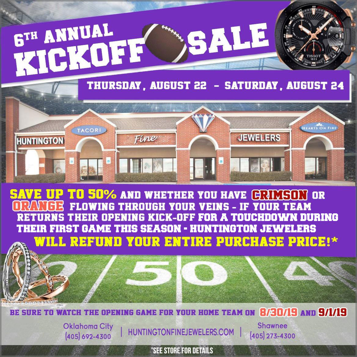 On August 22-24, customers can take up to 50% off all diamond jewelry at the retailer’s Oklahoma City and Shawnee locations. Local football fans are also encouraged to tune into the first game of their favorite crimson or orange college team; if their team returns their opening kickoff for a touchdown, Huntington will refund their entire purchase.