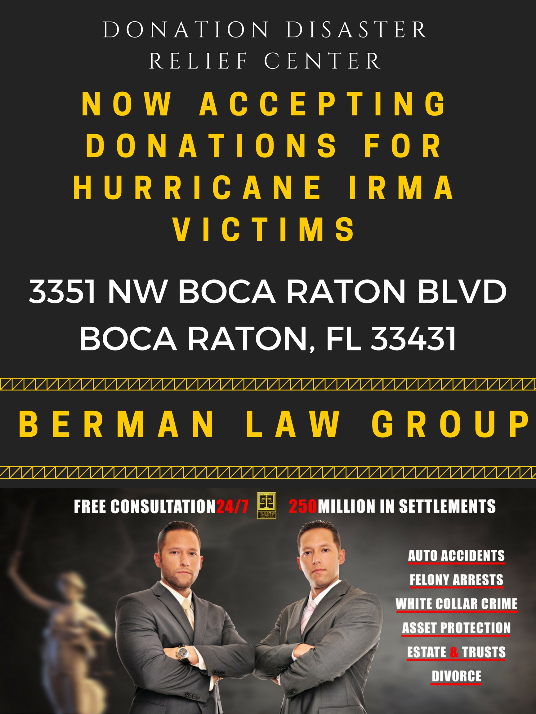 BOCA RATON, Fla., September 8, 2017 (Newswire.com) - The Berman Law Group, a Florida -based law firm known for its commitment to excellence and being committed to the community (tm) is hoping for the best through Hurricane Irma but on behalf of the community starting to plan for the worst. Today, The Berman Team announces that its main Florida Office in Boca Raton located at 3351 North Boca Raton Boulevard, Boca Raton, Florida 33431 and its 60 employees will operate post hurricane as a disaster relief center accepting goods Nationwide including baby formula, diapers, canned goods, dry goods, waters, first aid, hygiene products and donations made payable to The Berman Family Foundation. All proceeds will 100 percent be donated to hurricane victims. Please visit the Go Fund Me Page and send donations to the Boca address.