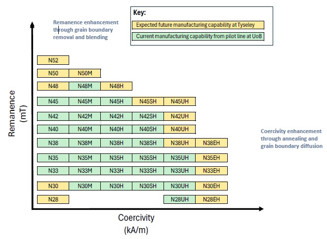 Through the abovementioned workstreams, together with further optimisation and development of blending and grain boundary technologies, HyProMag expects to significantly expand the range of commercial grades produced as illustrated below: