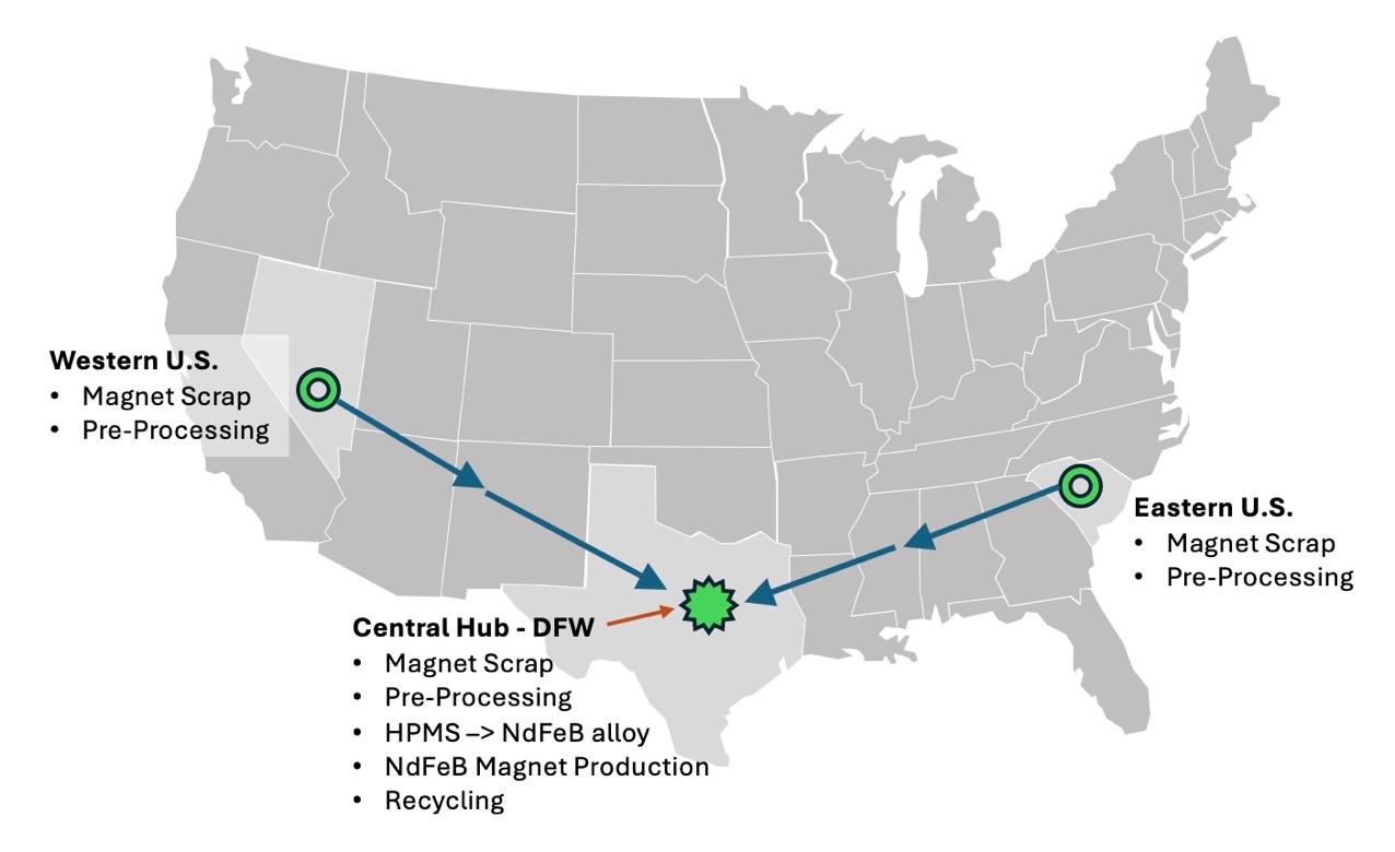 The Project is based on development of a state-of-the-art 40-year rare earth magnet recycling and manufacturing facility in Dallas-Fort Worth, Texas, capable of producing up to 750 metric tons payable of sintered NdFeB magnets and 291 metric tons of associated neodymium iron boron (NdFeB) co-products (total payable capacity - 1,041 metric tons NdFeB) annually. The potential recycling and manufacturing site is approximately 100,000 square feet in area, 36 feet in height and utilizes a pre-existing light industrial storage unit with basic utilities fully installed.