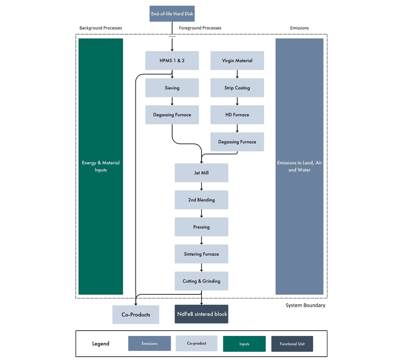 HyProMag USA primary product is 750 metric tons per annum of NdFeB sintered blocks and magnets at an average realised price per kg used in the the independent feasibility study. The project will co-produce several grades of co-products, which include magnet swarf, sintered block off cuts, HPMS NdFeB alloy powder for chemical processing, and for external processing. Environmental impacts have been allocated between the primary product and the co-products using economic allocation based on their respective market values throughout the study.