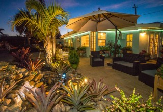 Motel rooms, studios and one-bedroom cottages are gathered around a quiet, relaxing pool. Buehler has placed tables for two, perfect for enjoying a sunshine coffee or for a quiet wine before dinner at the front door of each of these accommodations, as well as lush planters. Couples can choose privacy or partake in conversation with other couples. Several units also offer private back garden patios as well.
