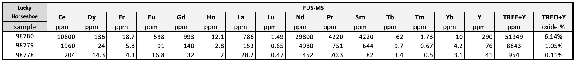 The table below shows three samples recently taken by IDR geologists which mark the discovery of the Lucky Horseshoe carbonatite. Sample 98780 is representative of possible carbonatite ore, while Samples 98779 and 98778 are representative of the wall rock hosting the carbonatite.