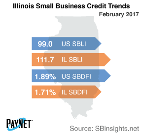 Coming in at 111.7, the PayNet Small Business Lending Index (SBLI) for Illinois exceeded the national SBLI level (99.0) despite declining by 0.4% from last month's state level.