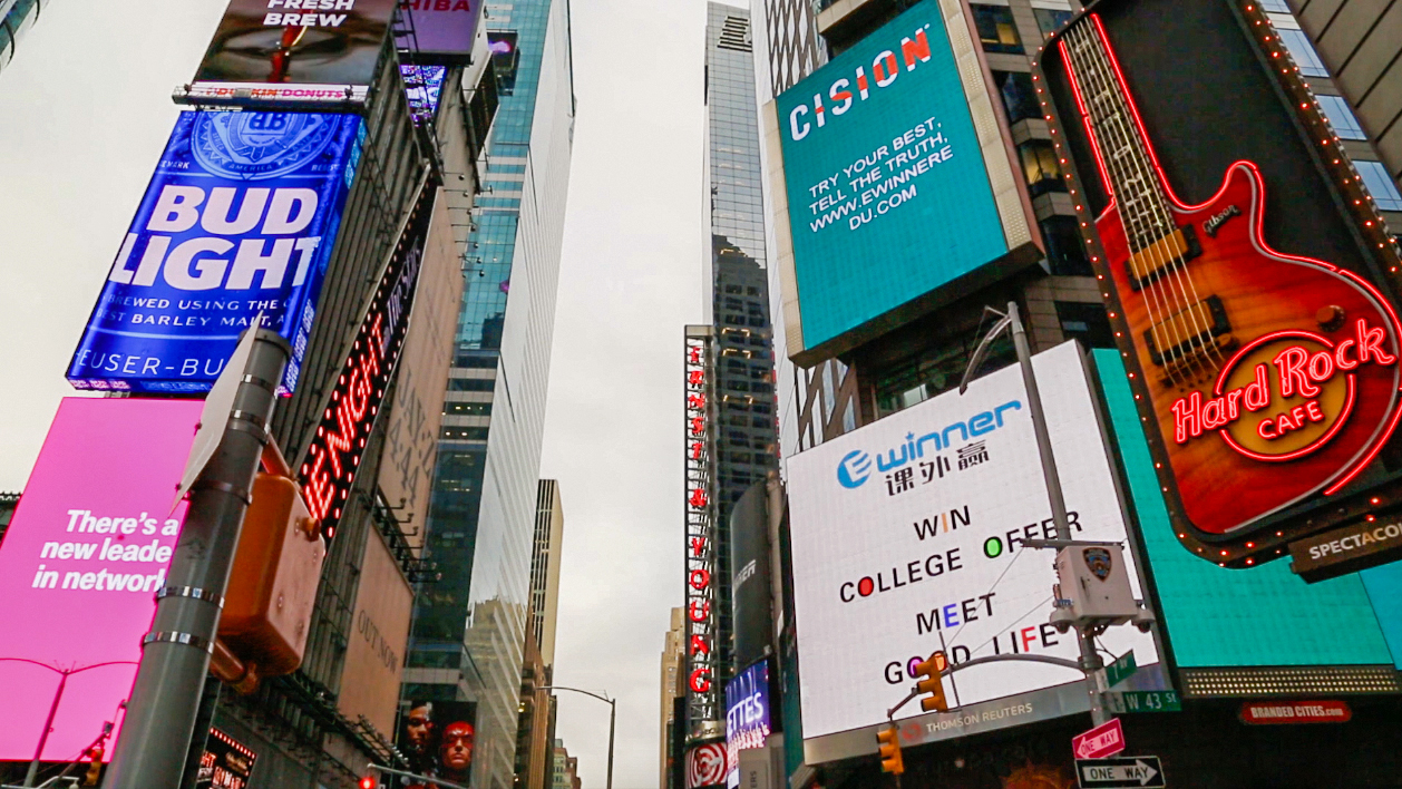 By the appearance in New York Times Square, Ewinner Education demonstrates the competence and vitality of Chinese enterprises worldwide, extends the influence of Chinese brands and establishes a brand new benchmark for Chinese companies in the international market. The original intention of Ewinner Education is to help the outstanding Chinese students show themselves on the stage of the world and also make the world understand the spirit of Chinese enterprises. "TRY YOUR BEST, TELL THE TRUTH." This is Ewinner Education that speaks for Chinese brands, for "MADE IN CHINA."