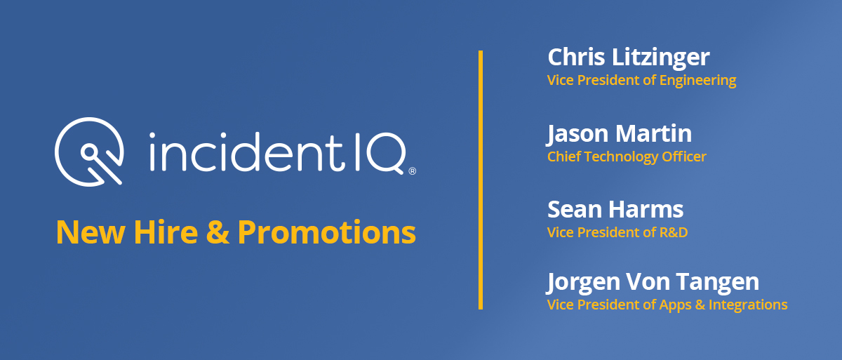 Chief Software Architect Jason Martin has been named Chief Technology Officer, while longtime Incident IQ development team leaders Sean Harms and Jorgen Von Tangen have been promoted to VP of R&D and VP of Apps & Integrations, respectively.