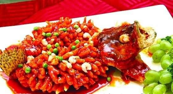 Most famous for its vegetable and fish dishes, Suzhou cuisine emphasizes freshwater fish, especially eel and carp. A signature dish that has been around for more than 200 years is “Mandarin Fish.” The name is derived from the dish’s resemblance to a squirrel, which when cooked the meat is made to protrude outwards like the fur due to its lack of bones and soft meet. The fish is deep fried, and a sweet and sour sauce is poured on top to further enhance the flavor. Regarded as the traditional dish to celebrate family occasions, holidays and banquets, the festive presentation of this main course sets the tone for celebratory gatherings.