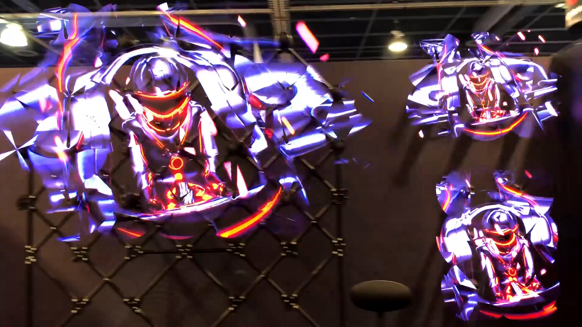 The holographic displays featured race cars and racing effects on the huge blended matrix Hypervsn 'walls' designed and installed by TLC Creative. Custom large-scale 'holograms' were integrated into large graphics for unique visual impact. Hypervsn 'holograms' have been getting attention at events around the world.