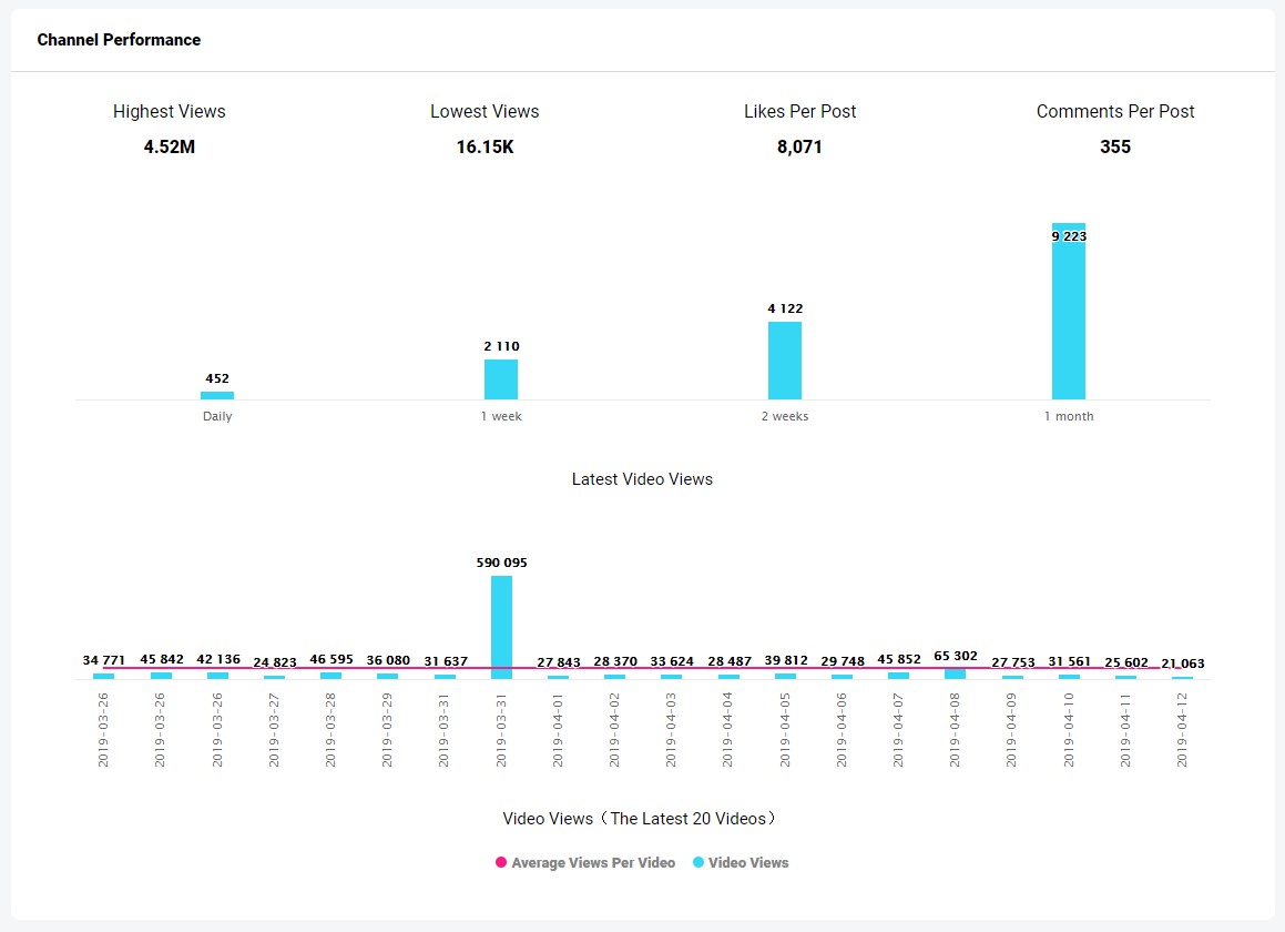 Analyzing influencers is also valid on InflueNex. It helps users to analyze the influencer with visualized charts. The main analysis component tools include engagement, YouTube growth tendency, channel performance, YouTube subscriber tendency, YouTube posts, and more.